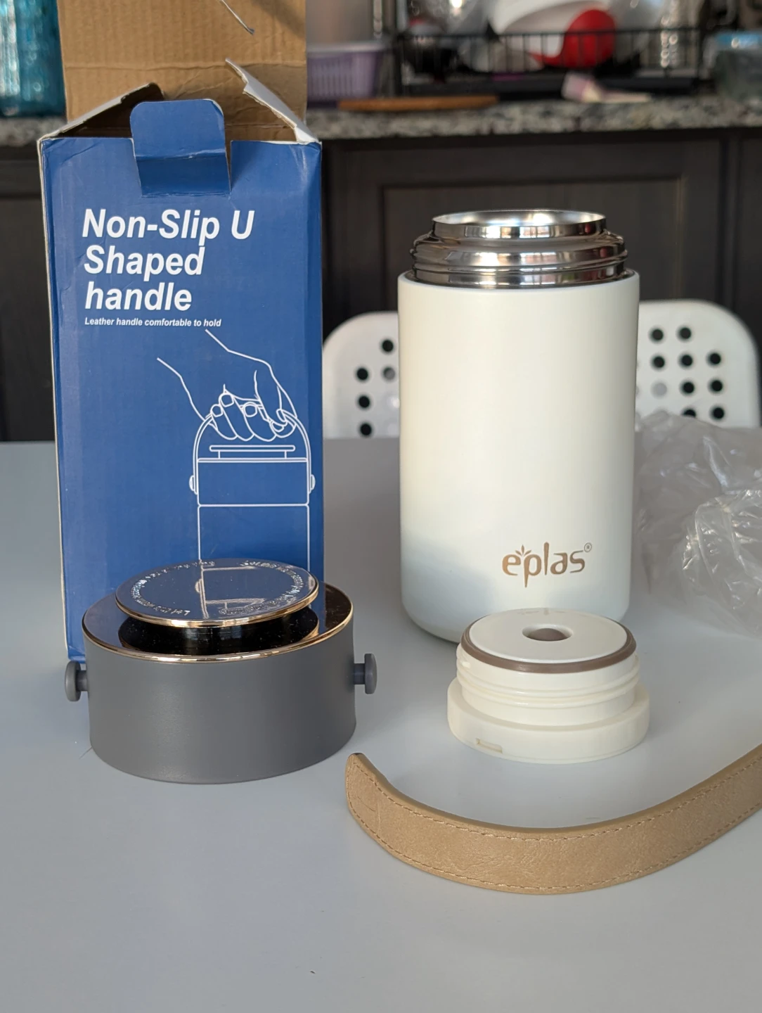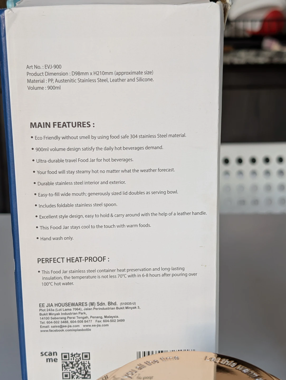 I'm selling an Eplas EVJ-900 food jar with a 900ml volume. It's made of PP, Austenitic Stainless Steel, Leather and Silicone.
