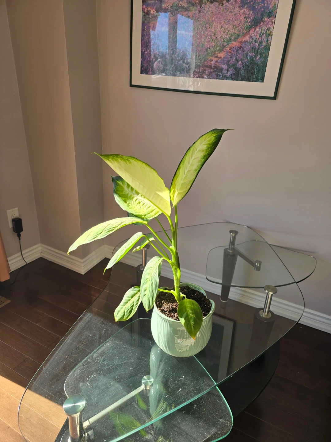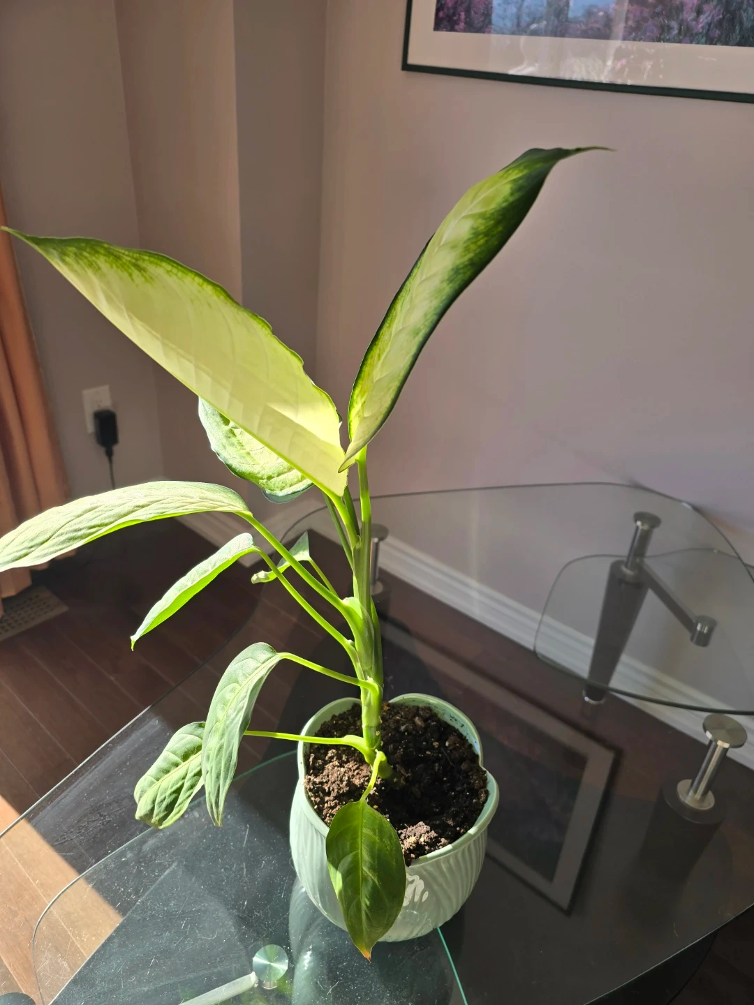 I'm selling a healthy Dieffenbachia plant! It's currently potted in a cute, light green ceramic pot and is ready to brighten up your space. The leaves have a lovely variegated pattern with shades of green and cream