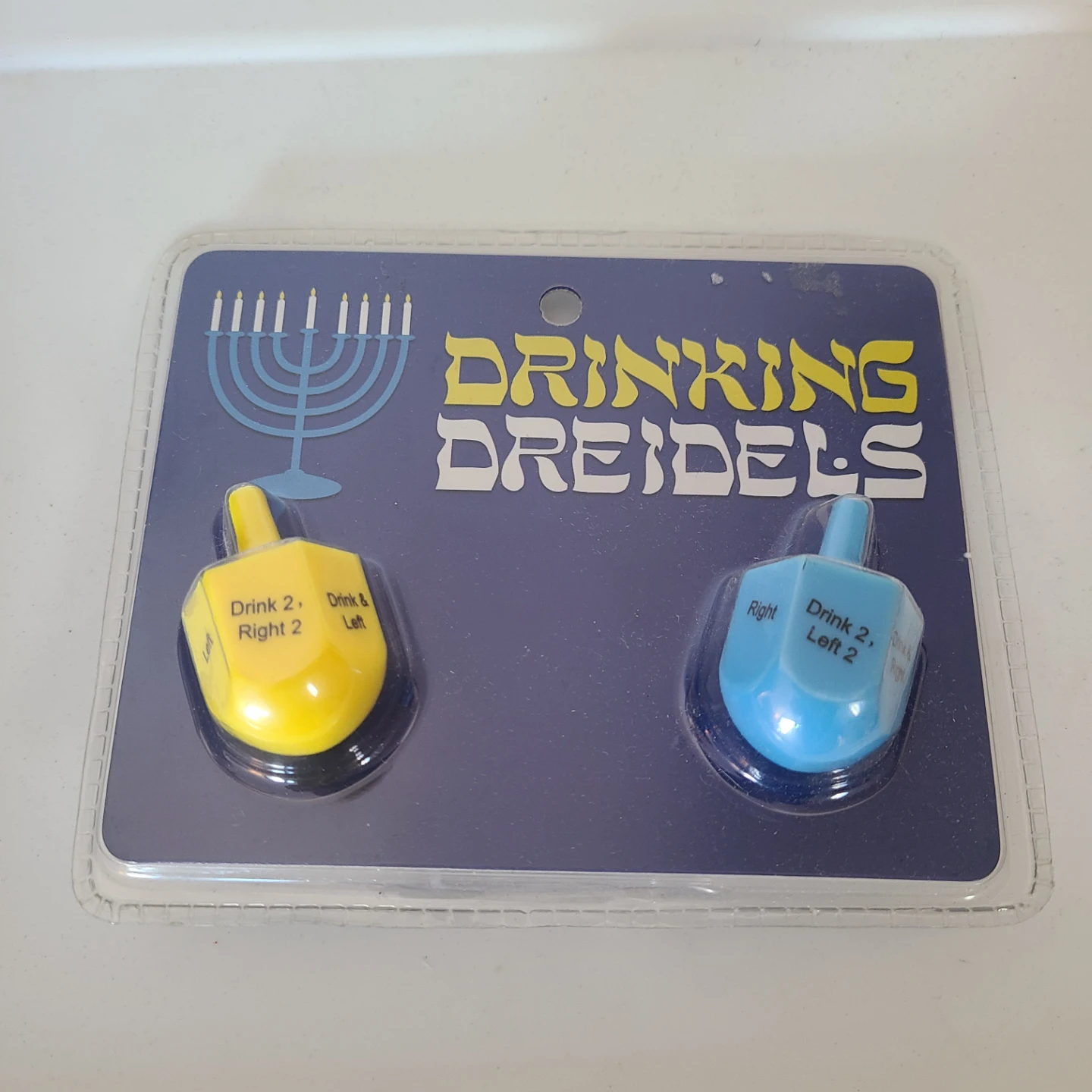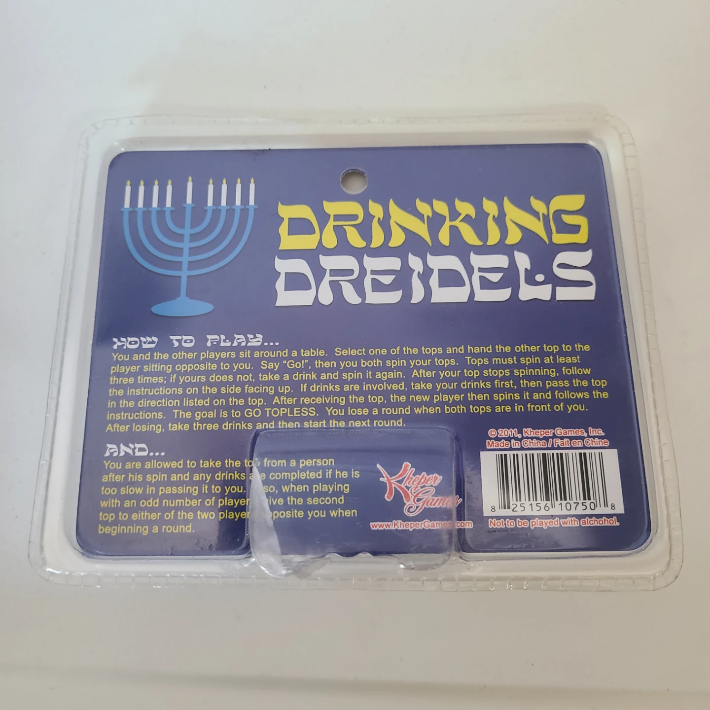 Brand new Drinking Dreidels game, still sealed in its original packaging! This fun game is perfect for parties and gatherings. The package includes two dreidels with instructions on how to play on the back. Get ready to spin and drink!