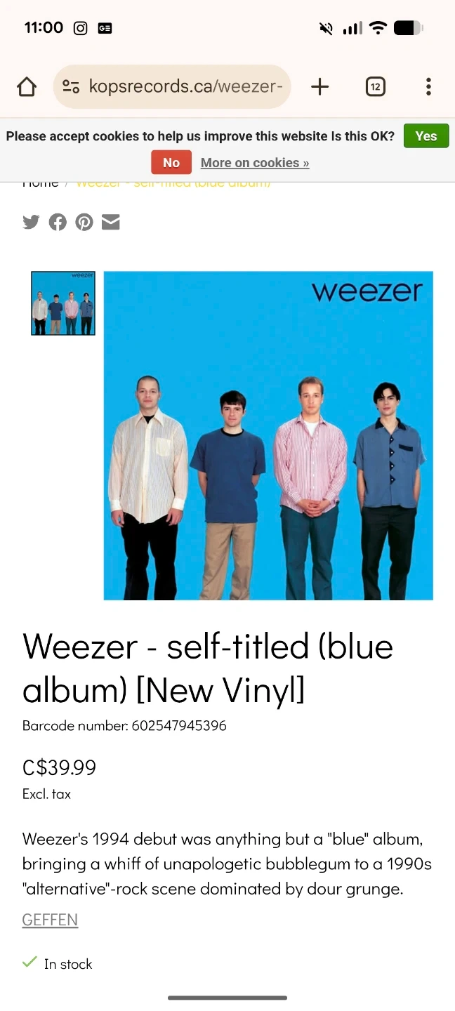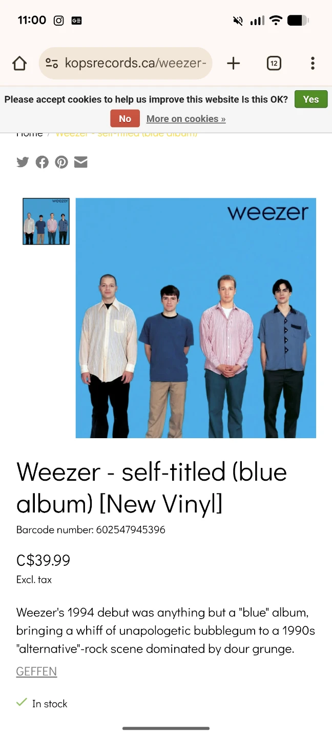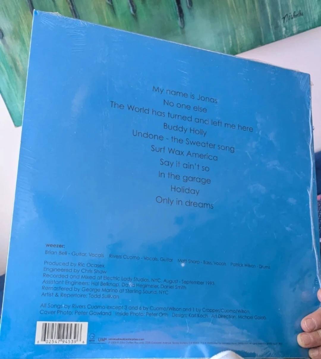 Selling a brand new, still-sealed Weezer self-titled blue album on vinyl! This is their 1994 debut album. Great as a gift and currently selling for $39.99+tax at Kops Records.