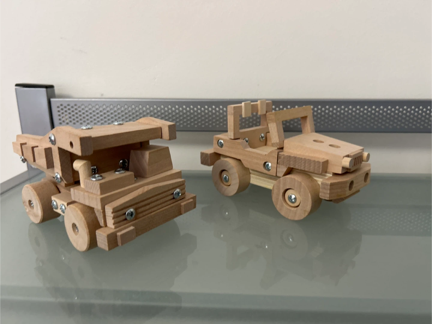 Selling a cute pair of handmade wooden toys! There's a dump truck and a jeep, both made of light-coloured wood and held together with screws. They're in great shape and ready for a new adventure!
