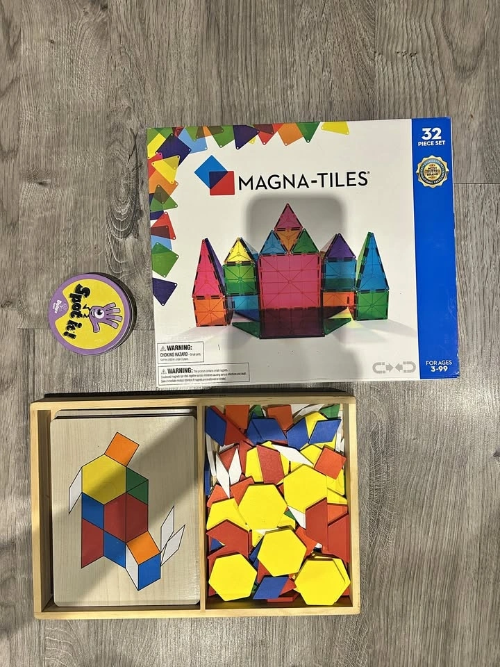 Magna-Tiles alone are often $80 CAD new. Spot It! is $15 CAD. Melissa & Doug Pattern Blocks is $32 CAD