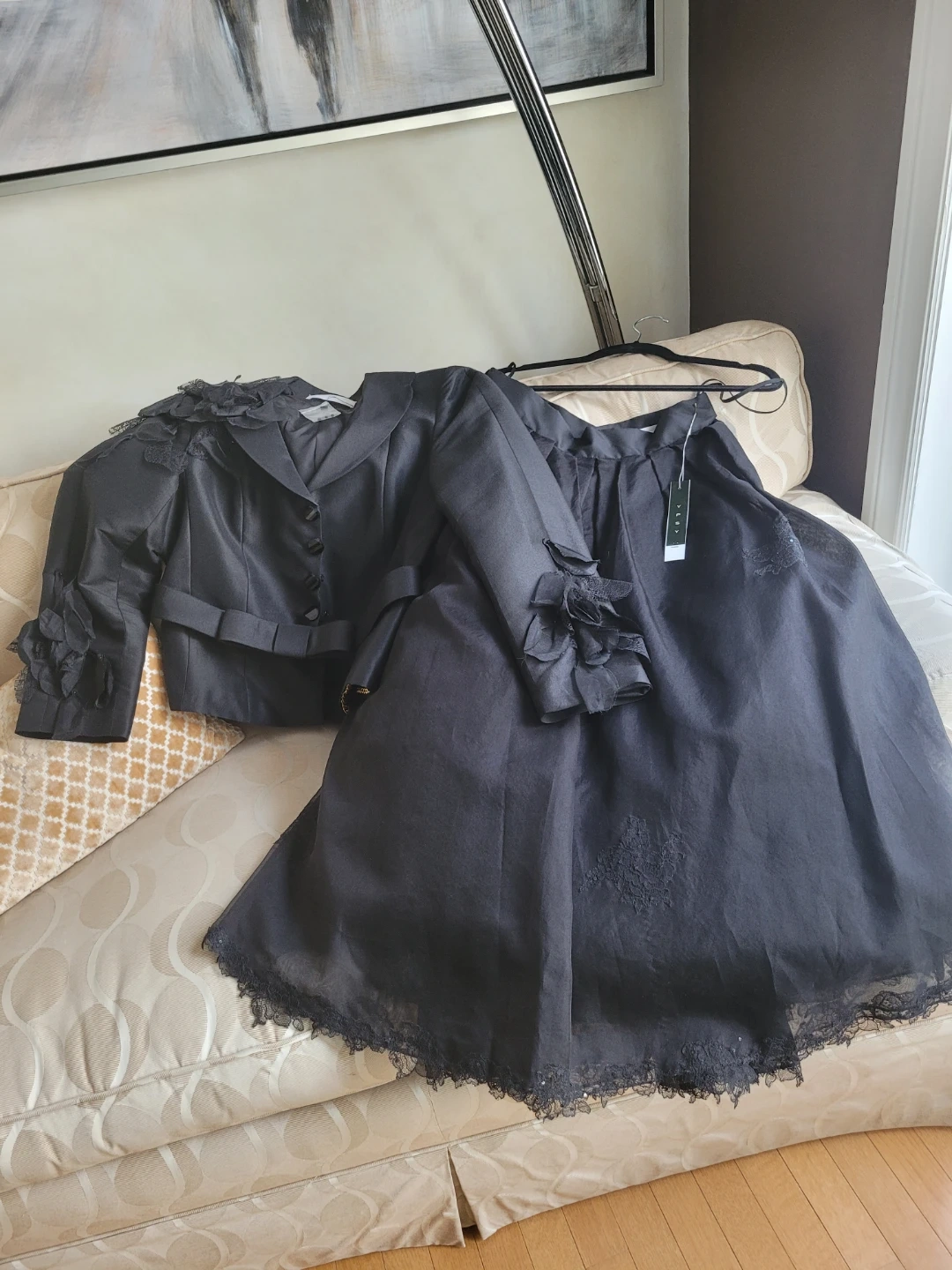 New with Tag - David Pallas French Haute Couture Designer of YPSY Beautiful black silk & lace skirt suit. The jacket features lovely hand applique ruffles and a flattering silhouette. The skirt has a French lace trim, crystal beads & sequins a flowing design. Perfect for a special occasion or a chic everyday look!