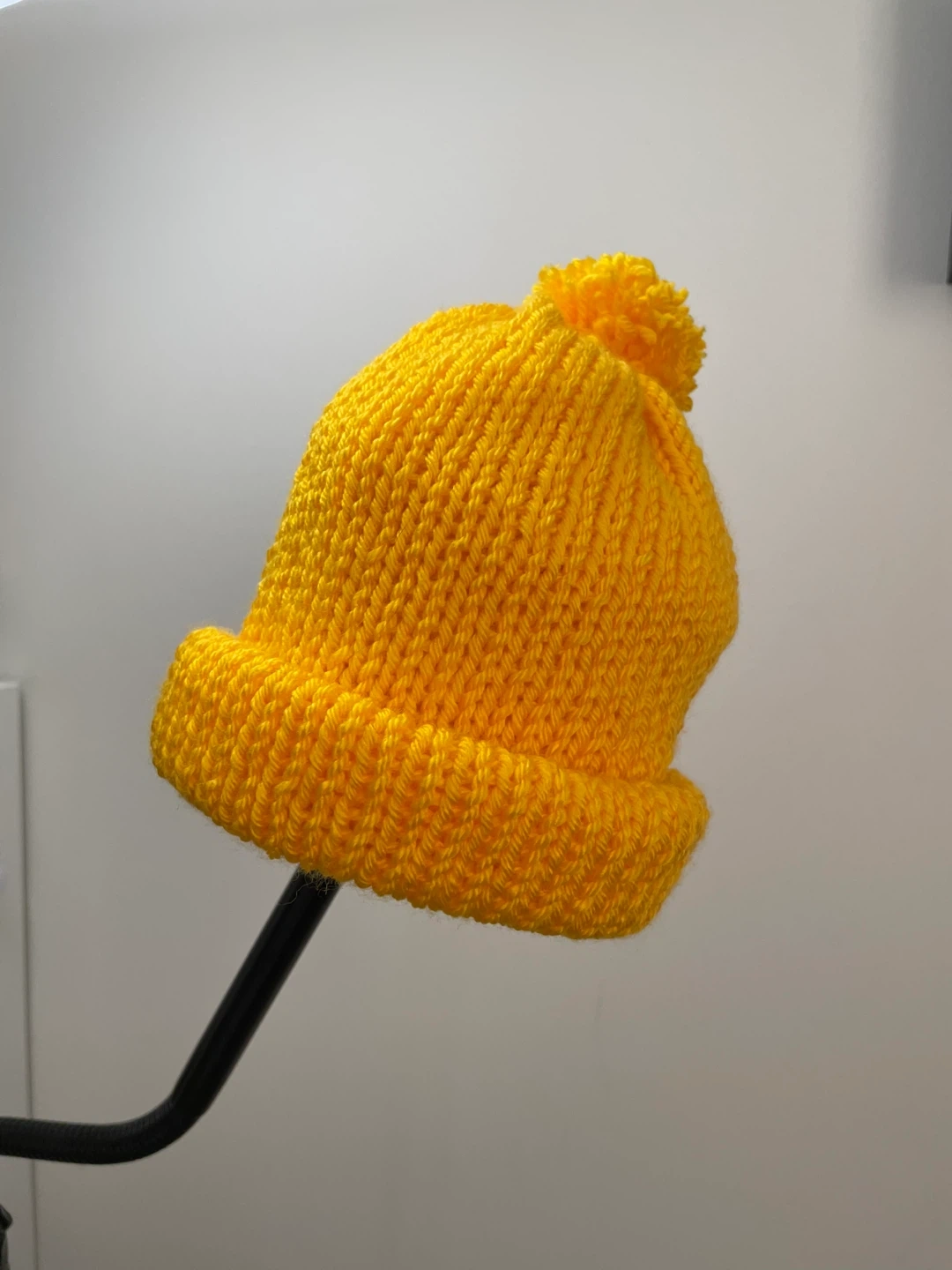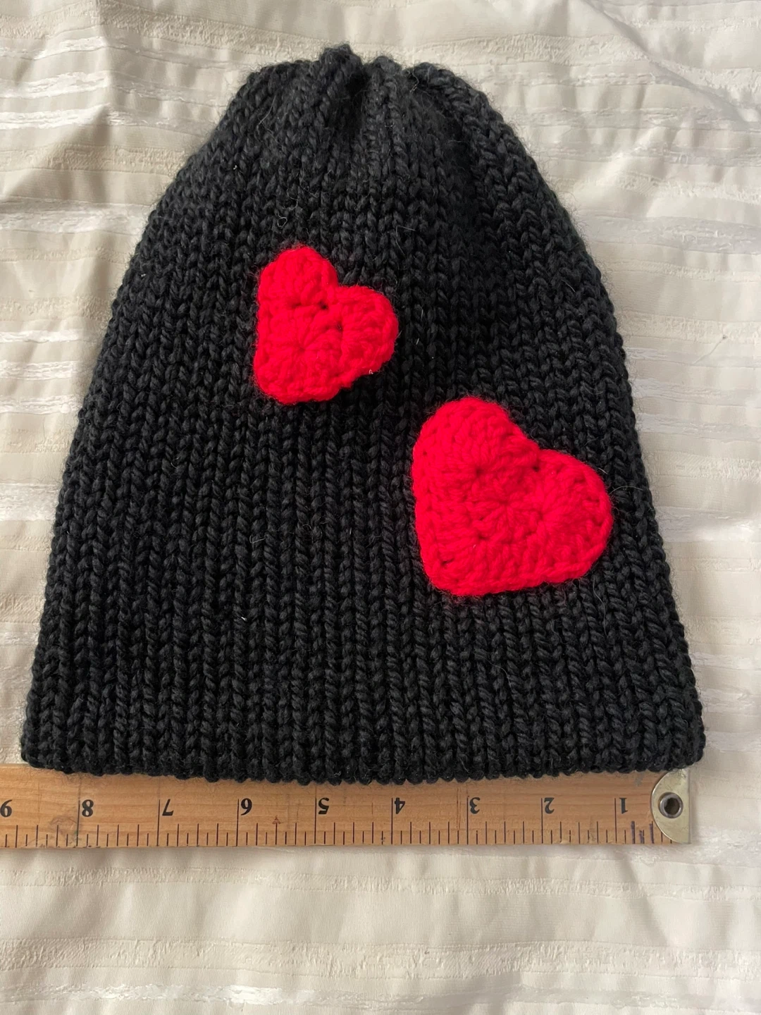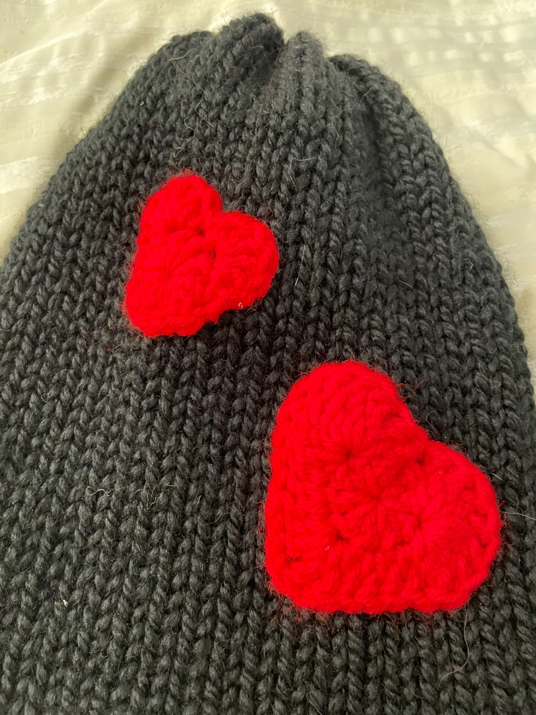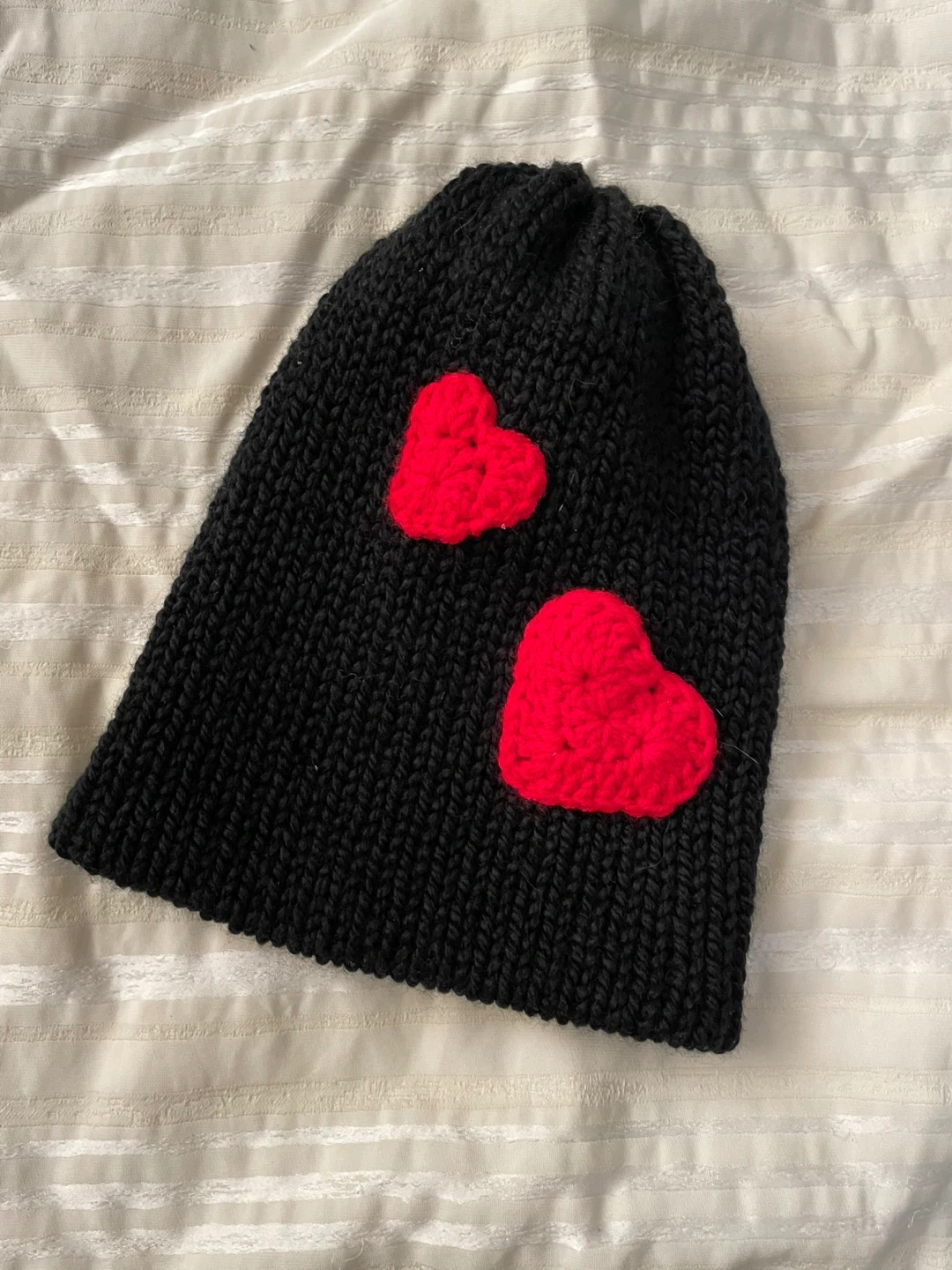 I'm selling these cute handmade knitted beanies! One is black with red hearts, and the other is a bright yellow with a pompom. They're both in great condition and ready to keep you warm this winter