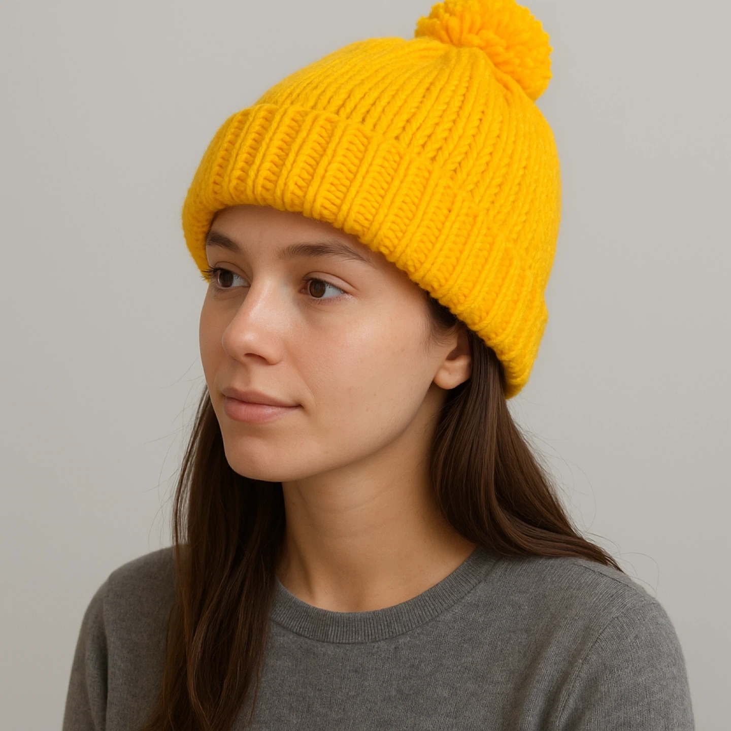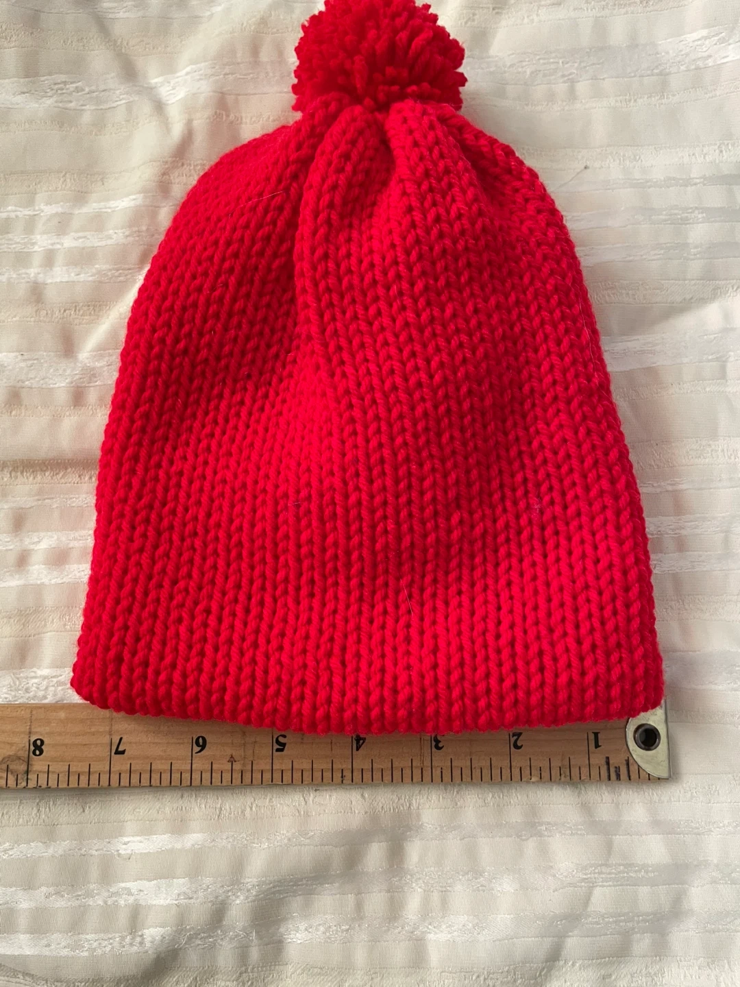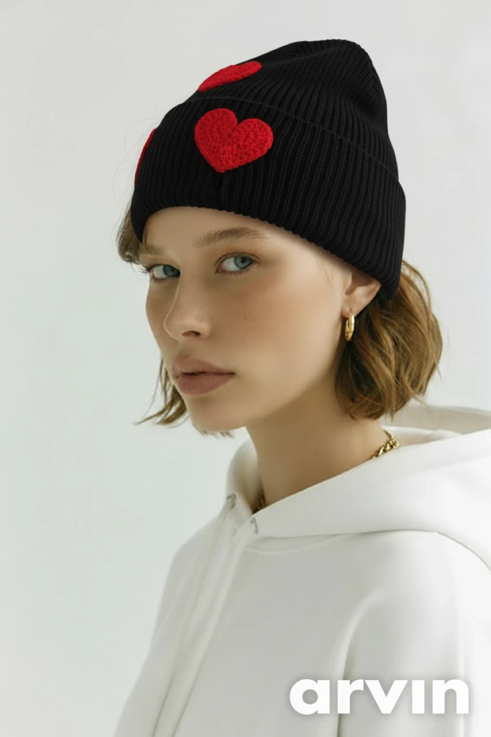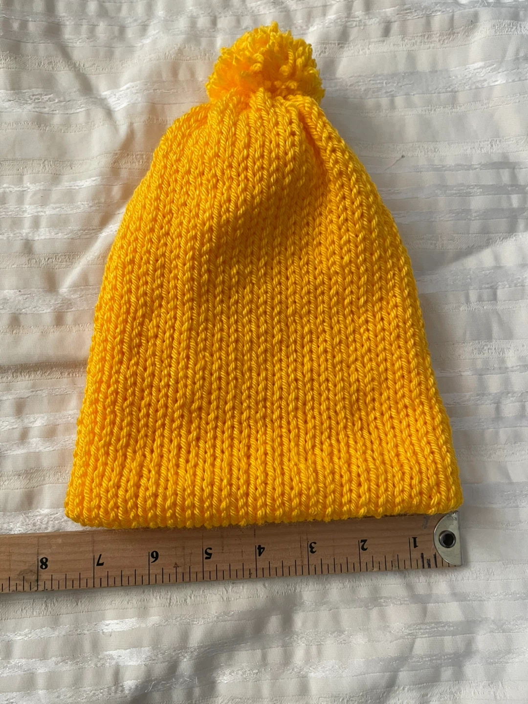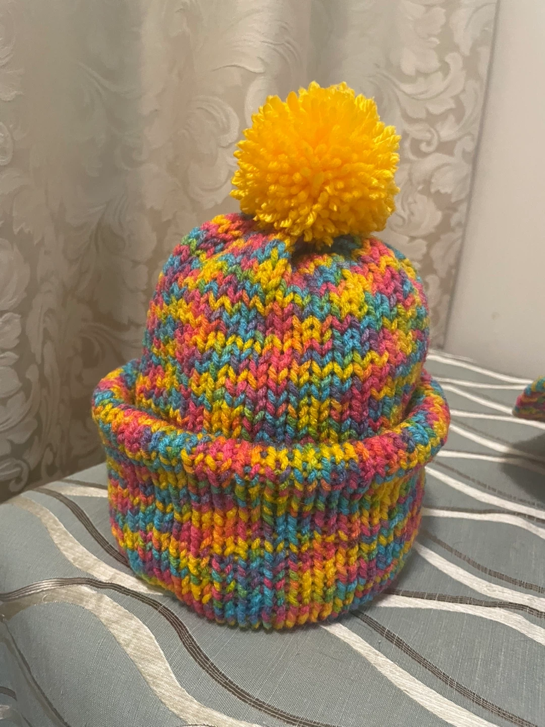 I'm selling these cute handmade knitted beanies! One is black with red hearts, and the other is a bright yellow with a pompom. They're both in great condition and ready to keep you warm this winter