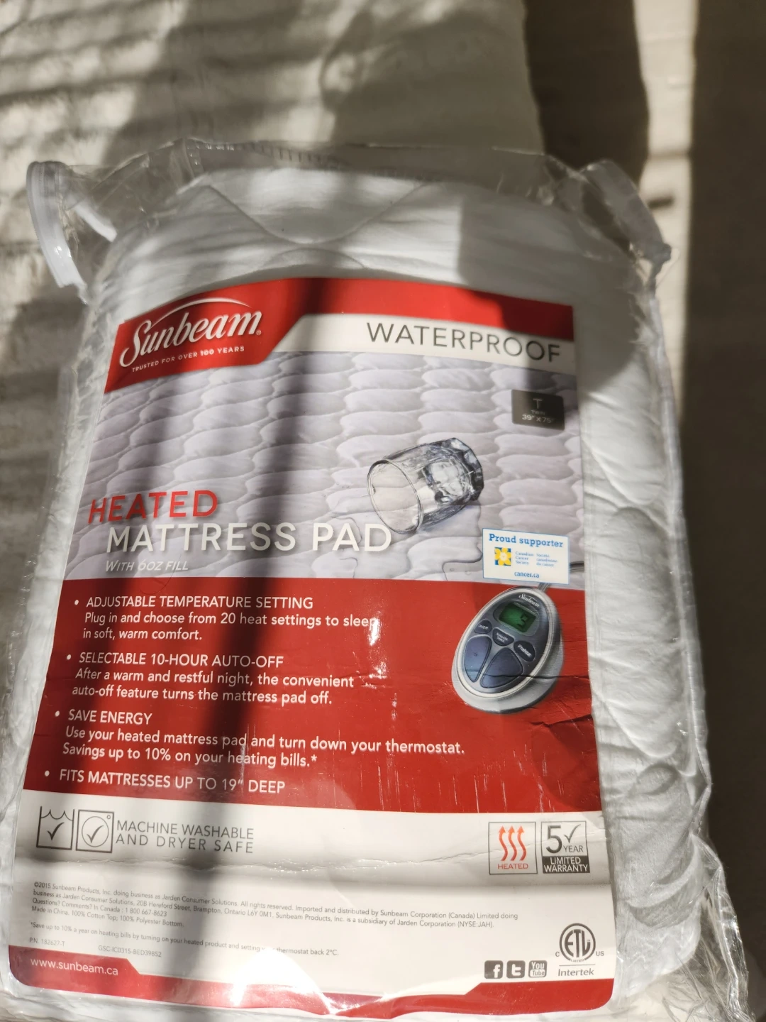 Keep cozy all night long with this Sunbeam waterproof heated mattress pad! It's a twin size (39" x 75") and features adjustable temperature settings with 20 heat settings to choose from. It also has a selectable 10-hour auto-off feature for peace of mind. Plus, it's machine washable and dryer safe for easy care