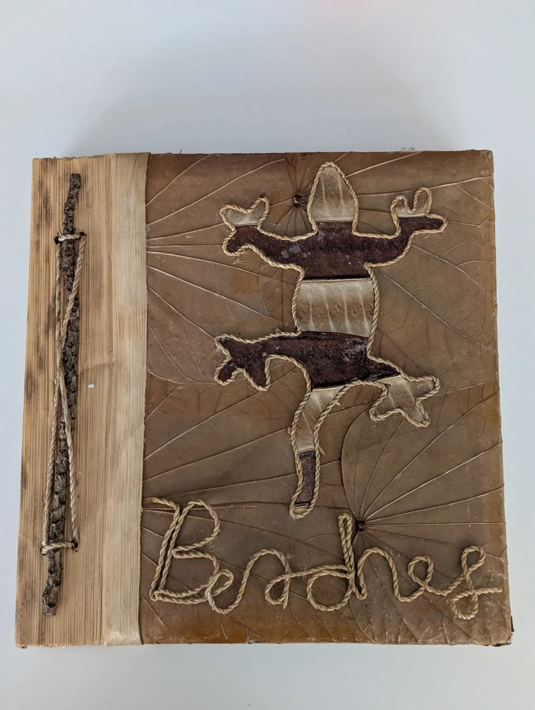Check out this unique, handmade photo album! The cover features a cool lizard design made from natural materials. It's perfect for storing your cherished memories in a special way. The pages are ready for your photos!