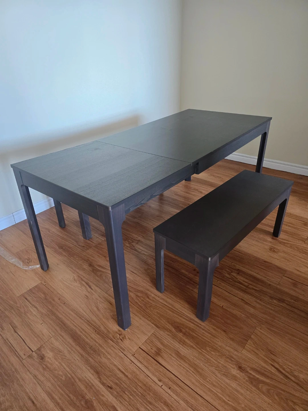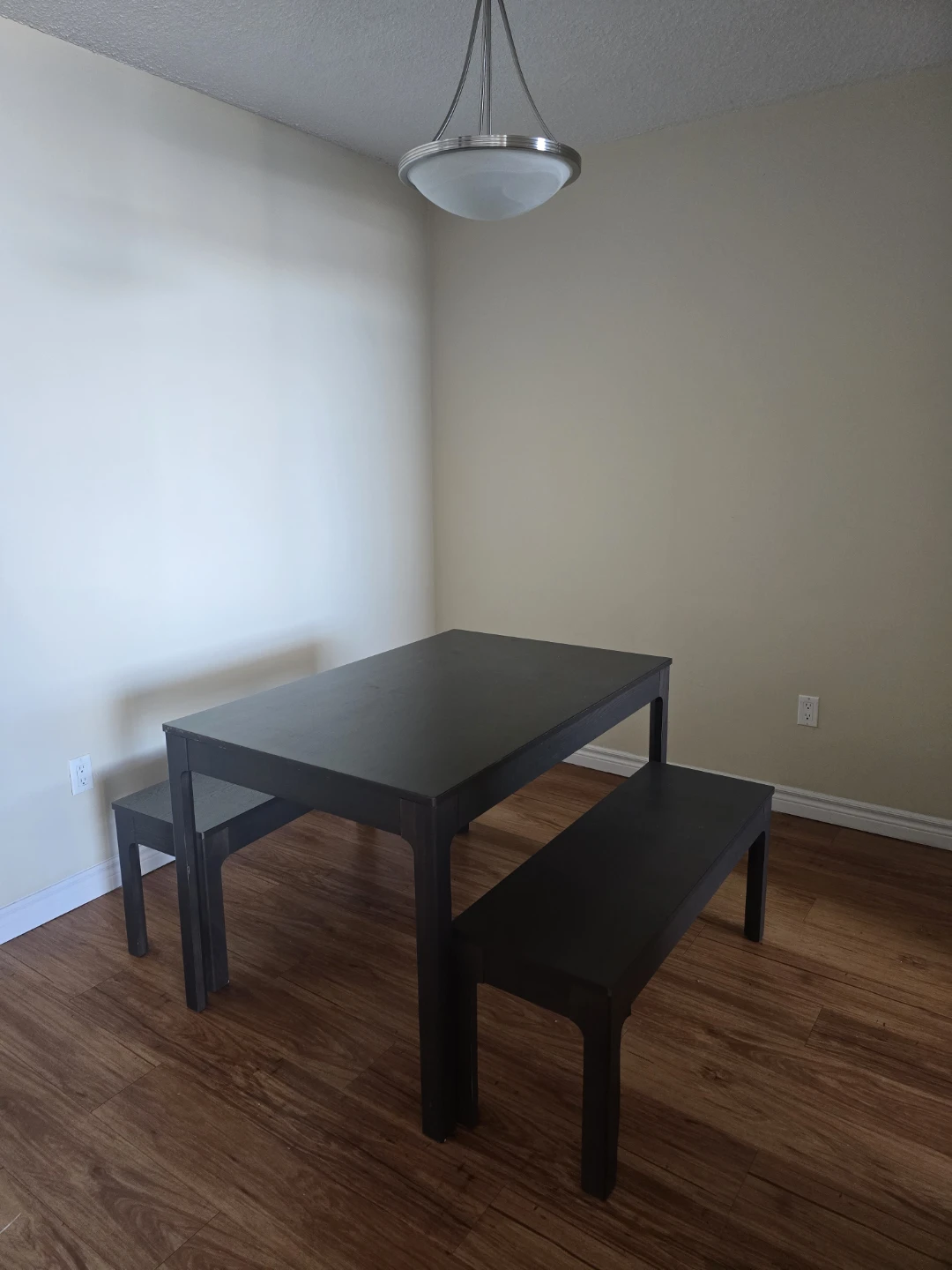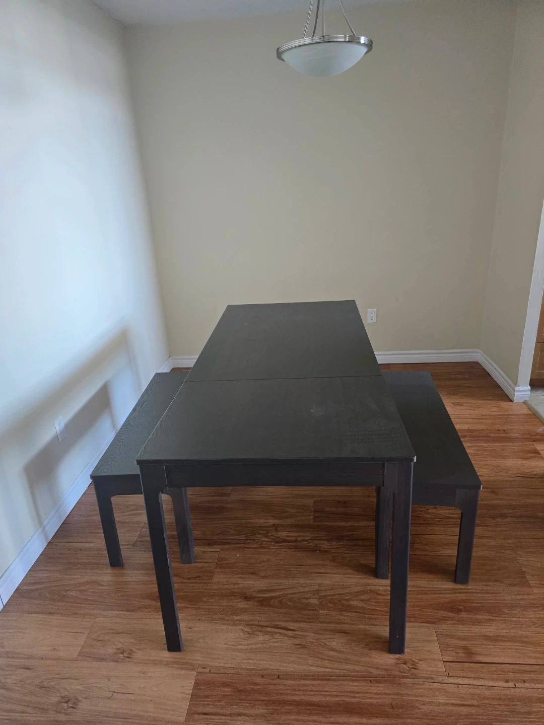 Selling a dining table with two benches! The table is extendable, making it great for both everyday use and when you have guests over. The laminate on the feet of 1 bench is peeling off a little bit otherwise It's in great condition and ready for a new home. Let me know if you want me to disassembled it to fit on your car. Also it comes with other 2 individual chair(optional)