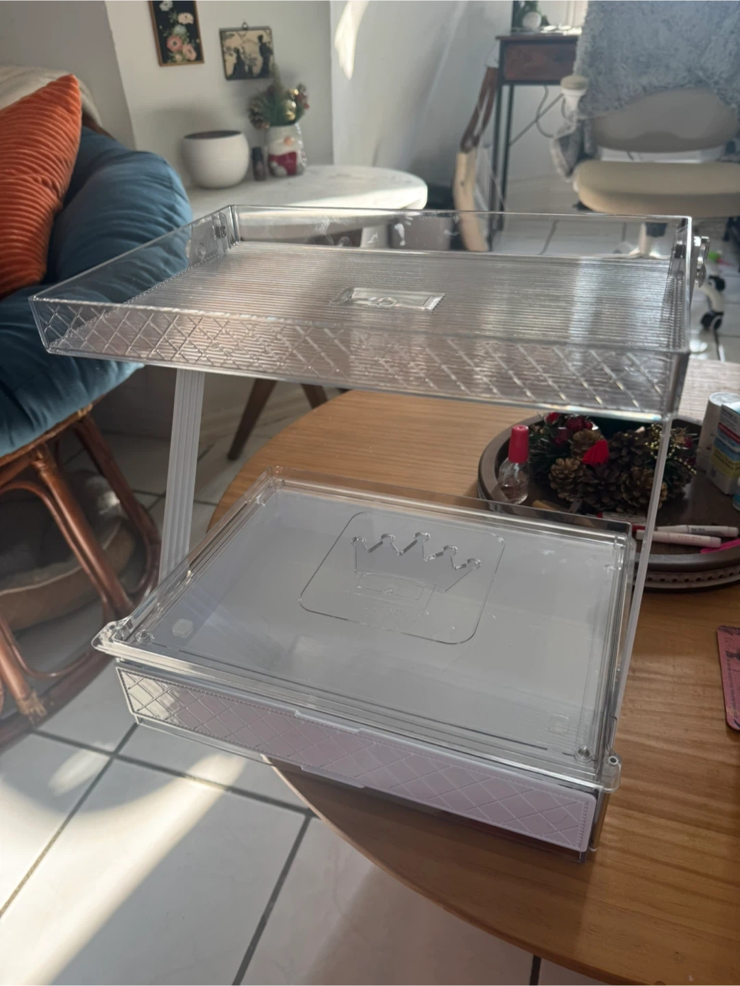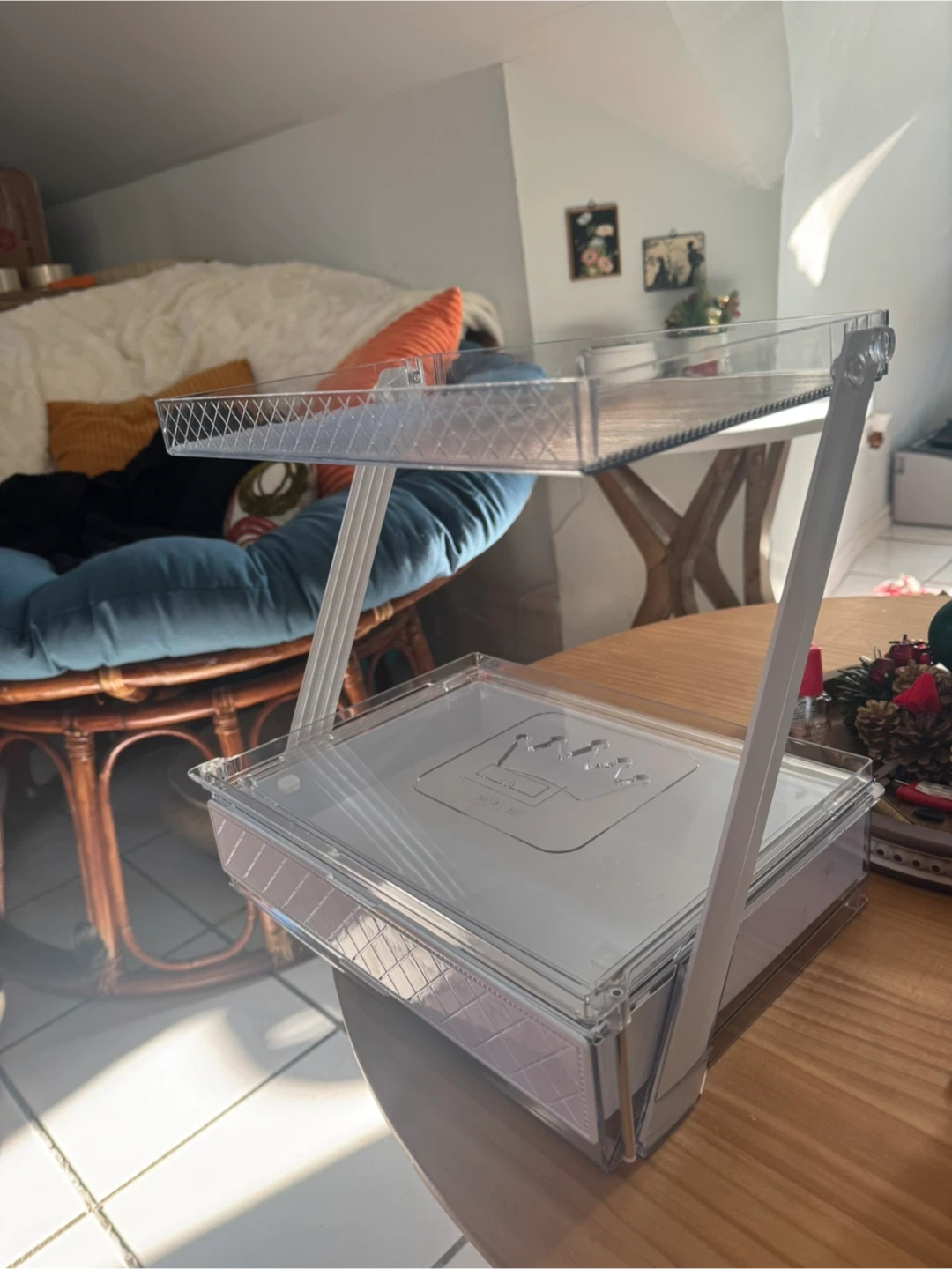 2-tier makeup/skincare organizer shelf. With a pull out drawer, pull out shelf and adjustable angle for top shelf. Basically brand new. Original price $45
