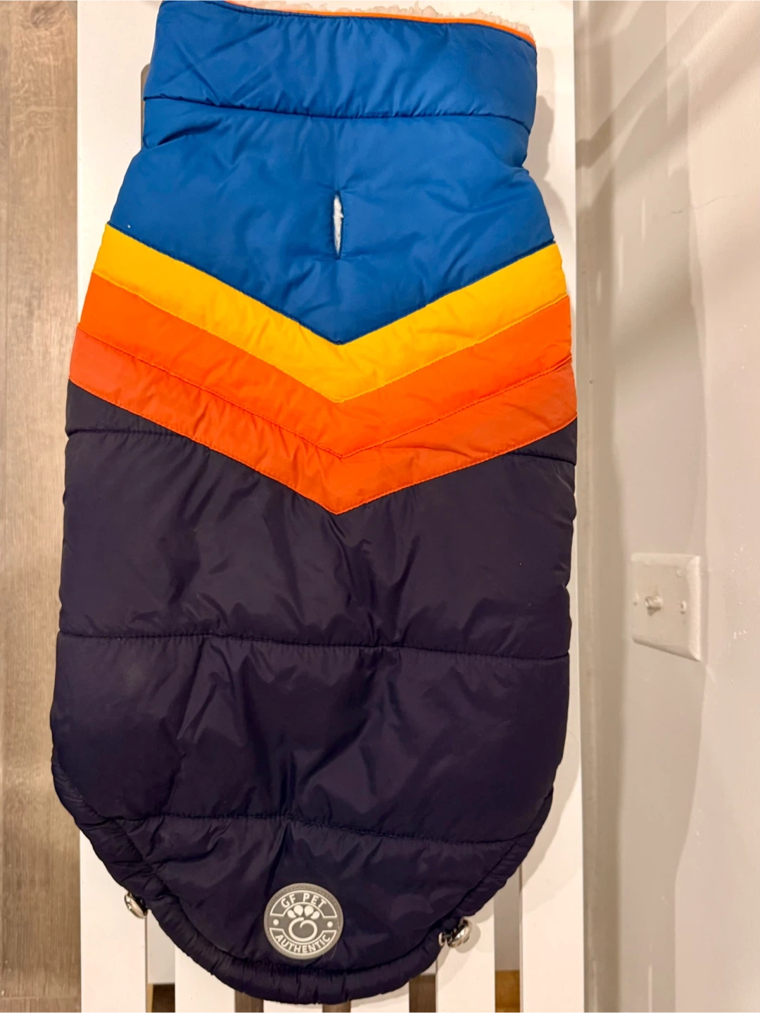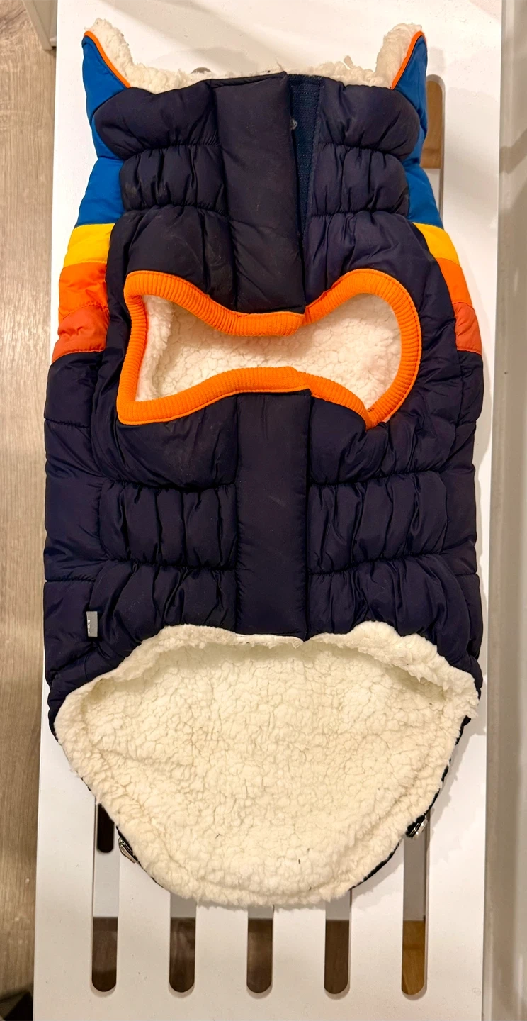 Keep your furry friend warm with this Canada Pooch puffer vest! It's for a medium size dog and features a stylish colour block design with a cozy sherpa lining. Perfect for those chilly Canadian walks!