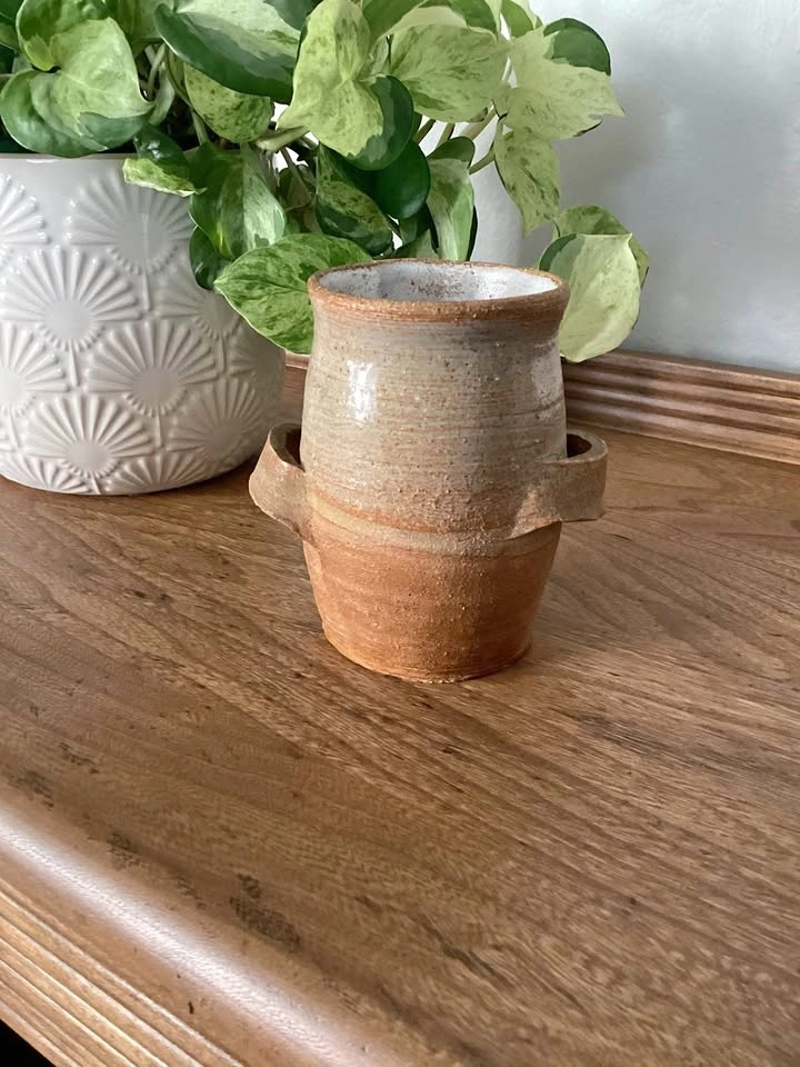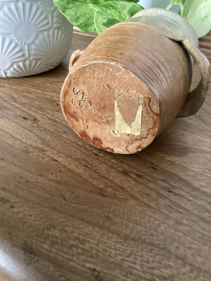 Beautiful handmade stoneware vase with a warm, earthy glaze and rustic form. Wheel-thrown with lovely natural texture and subtle speckling. Features a hand-incised maker’s mark on the base (signed “SS”).