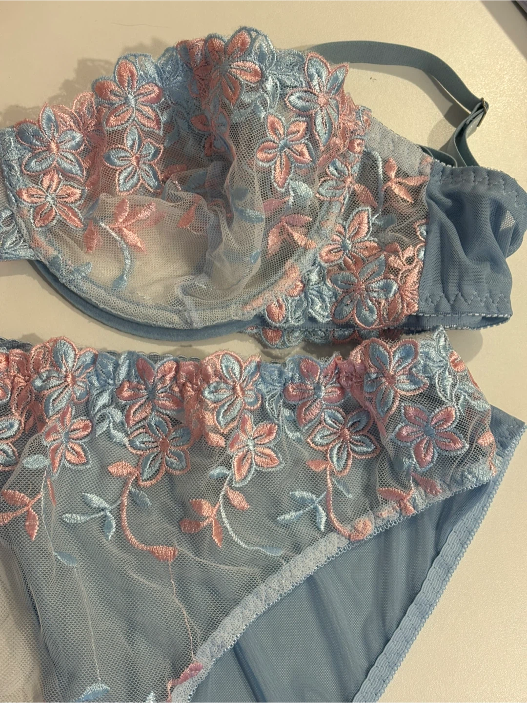Here's a pretty light blue lingerie set with floral embroidery! It includes both the bra and matching bottoms.