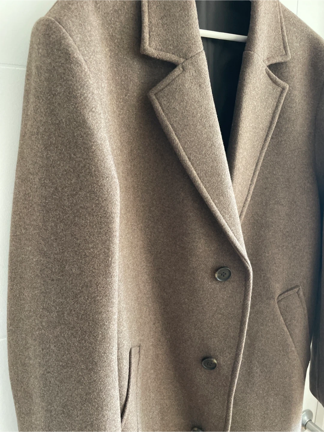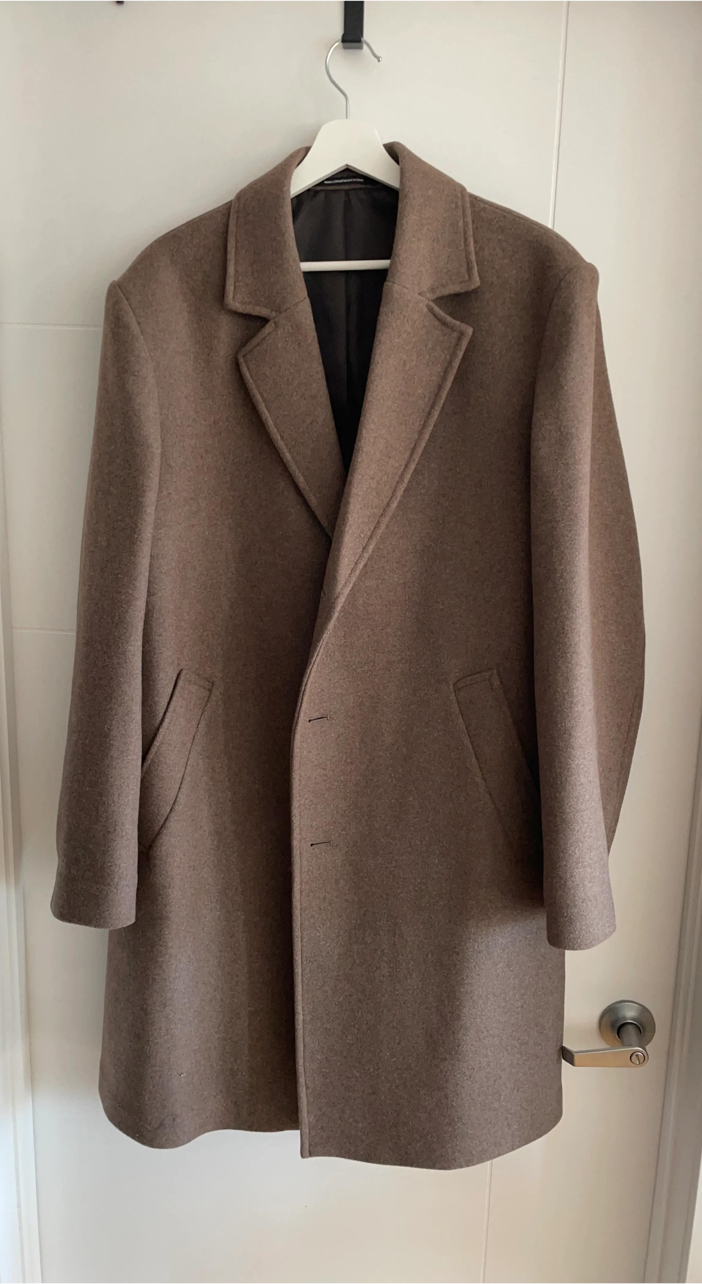 Selling a never worn H&M wool blend overcoat in size L. It's a stylish and warm coat, perfect for the colder months. The shell is made of 56% wool, 40% polyester, 2% polyamide, and 1% acrylic. The lining is 100% polyester.
