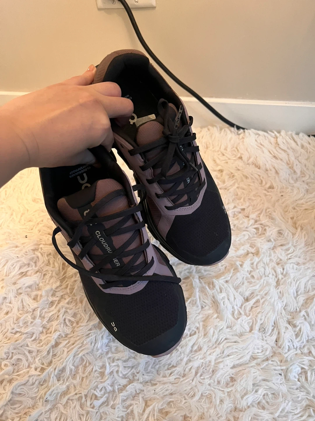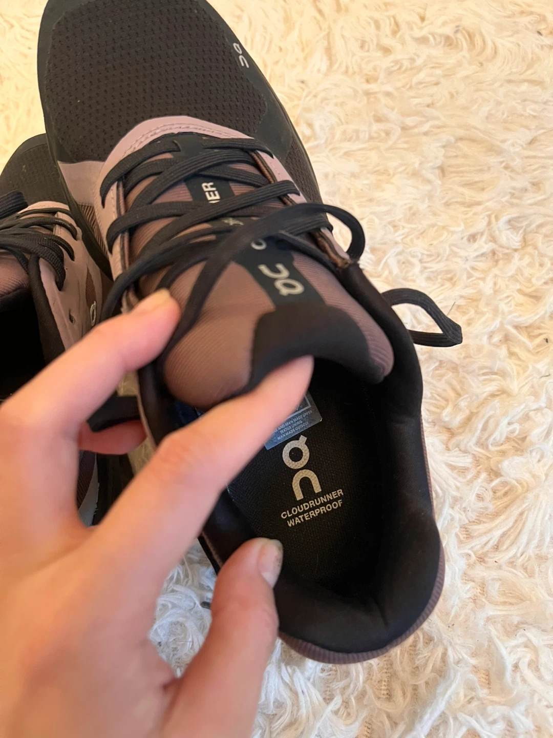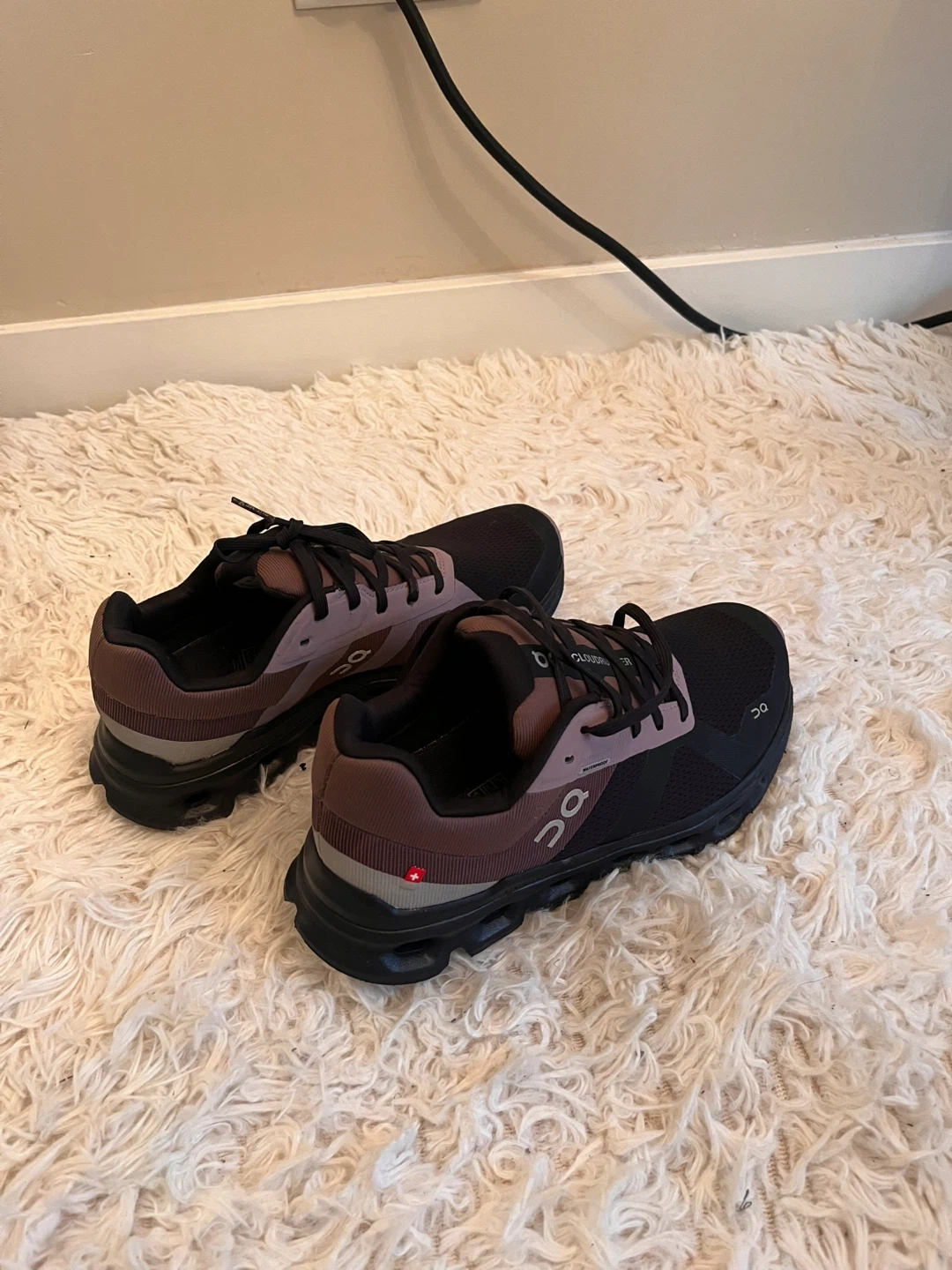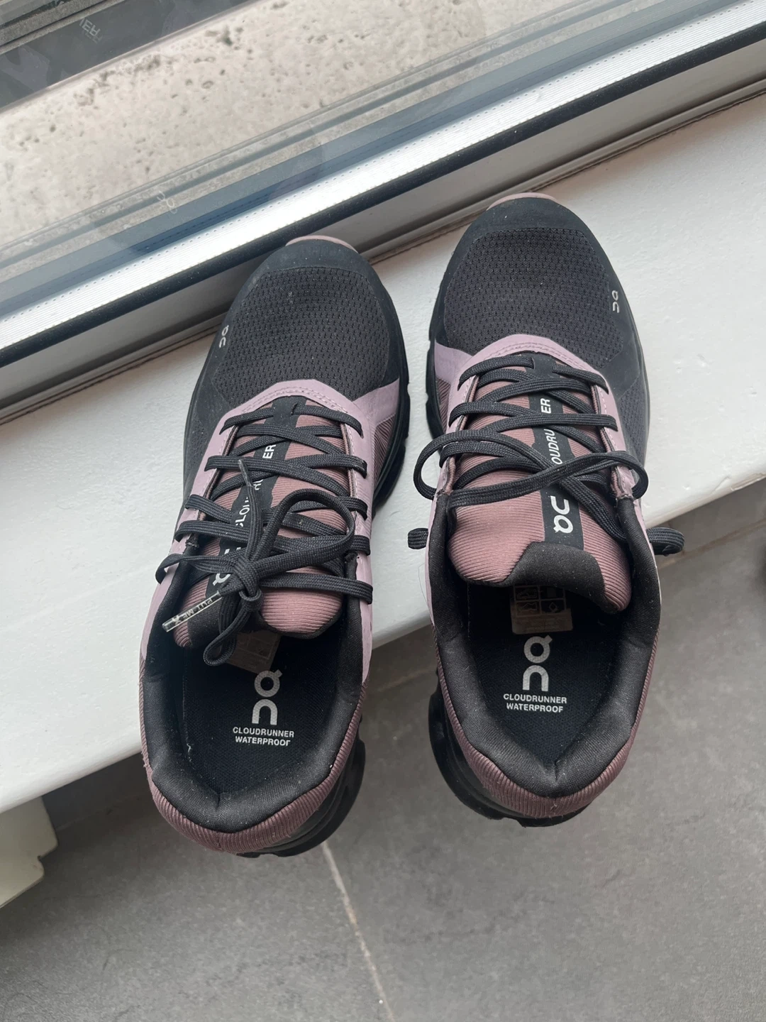 Selling a pair of female On Cloudrunner Waterproof shoes. They are in great condition and ready for your next run! The shoes are black and purple. Used less than a week