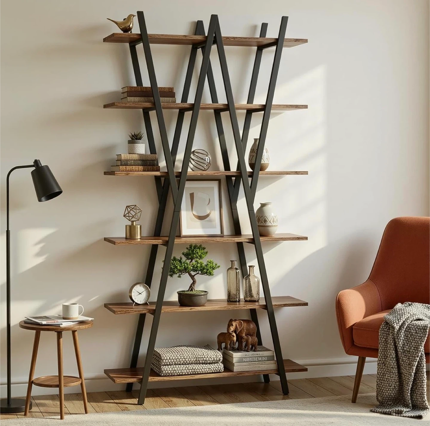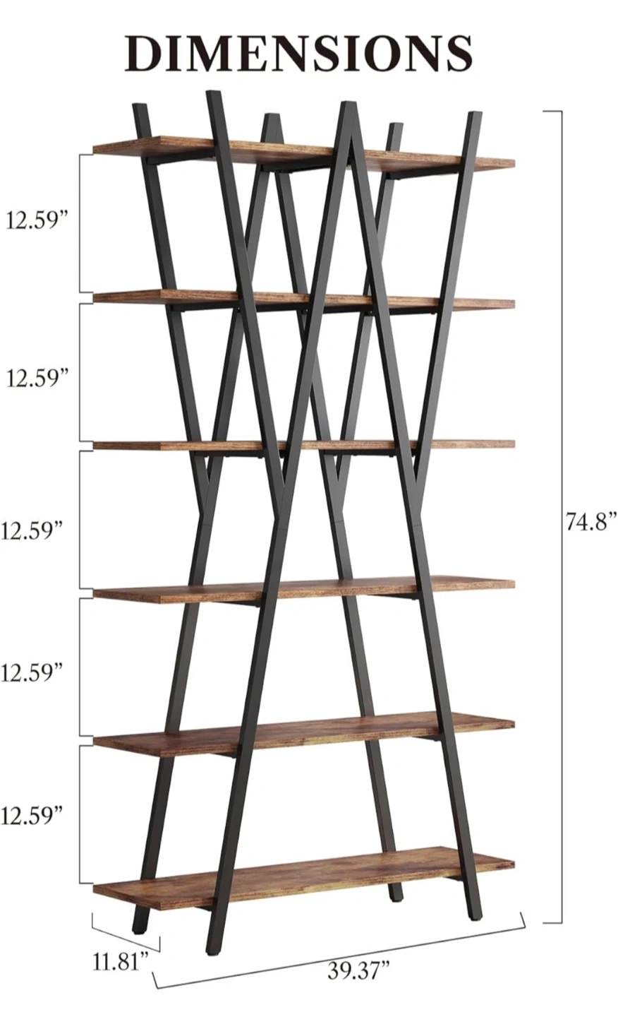 This ladder shelf bookshelf features a sturdy metal frame and durable shelves. It has adjustable foot pads for stability. The dimensions are approximately 74.8" tall, 39.37" wide, and 11.81" deep. The shelves are about 12.59" apart. Great for adding a rustic touch to your home!