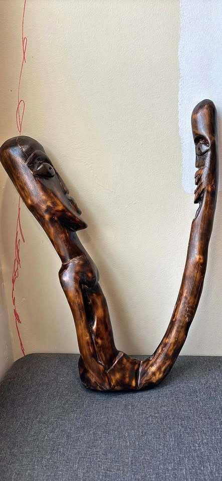 One-of-a-kind hand-carved wooden sculpture featuring two expressive faces formed from a natural branching piece of wood. The twisting, organic shape makes it a standout décor item — perfect for rustic, boho, eclectic, cottage, or art-focused spaces.