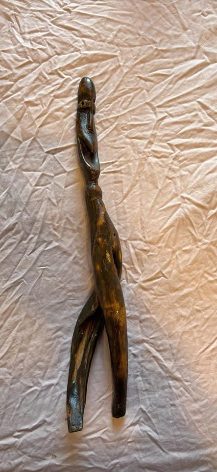 Slim, hand-carved wooden abstract figure with a twisted, organic shape. Light and easy to display — perfect for adding a touch of rustic or boho character to shelves, desks, or small accent spaces.