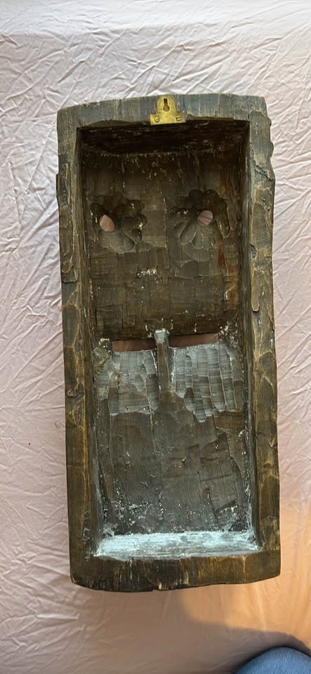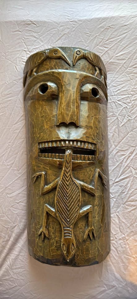 Striking hand-carved wooden mask featuring detailed bird carvings along the top and a large lizard motif down the front. Solid, heavy wood with visible chisel texture. A bold statement piece for wall décor, boho spaces, or rustic art lovers.