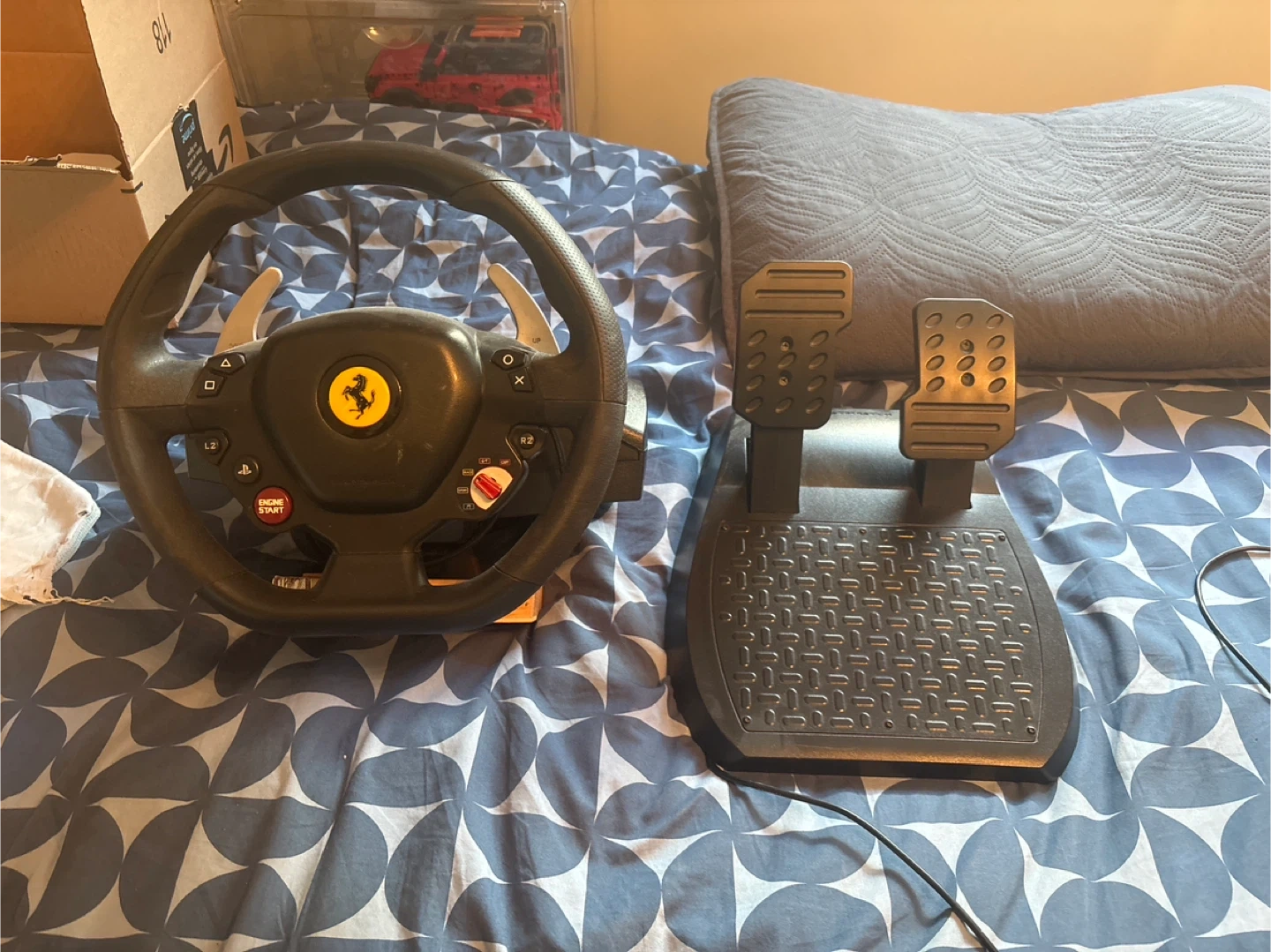 Selling a Ferrari branded racing wheel and pedal set. It's in good condition and ready for a new gamer! Perfect for racing games on your PC or console. Comes with both the wheel and the pedal set.