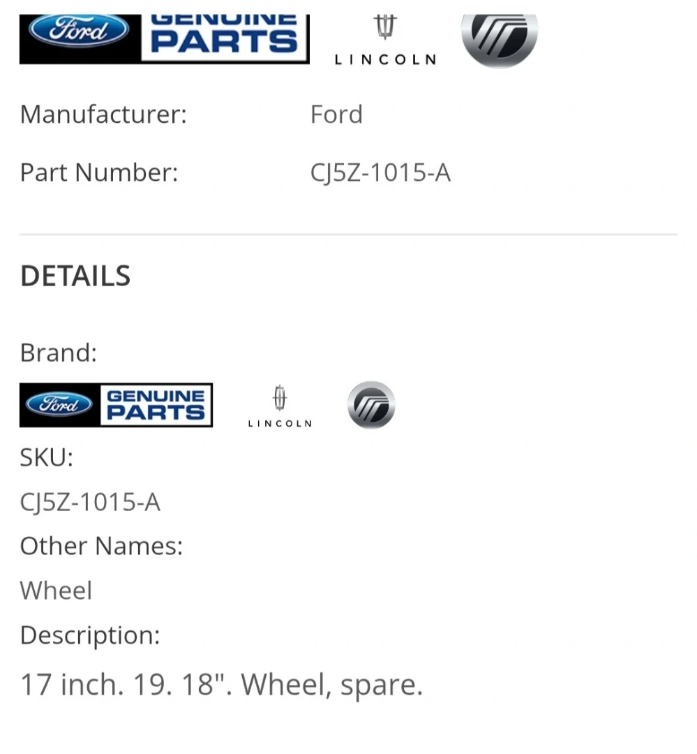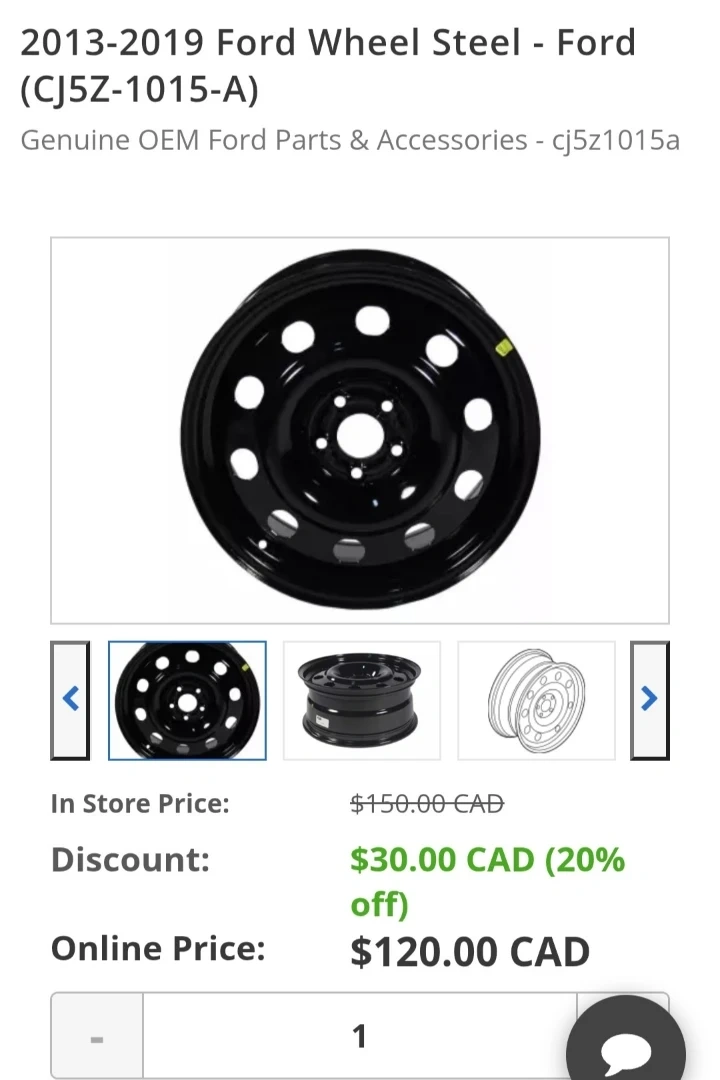 Selling a Ford steel wheel, part number CJ5Z-1015-AWSP. 17-19 inches Wheel, perfect as a spare! The wheel is compatible with 2013-2019 Ford models. It was originally priced at $150 CAD.