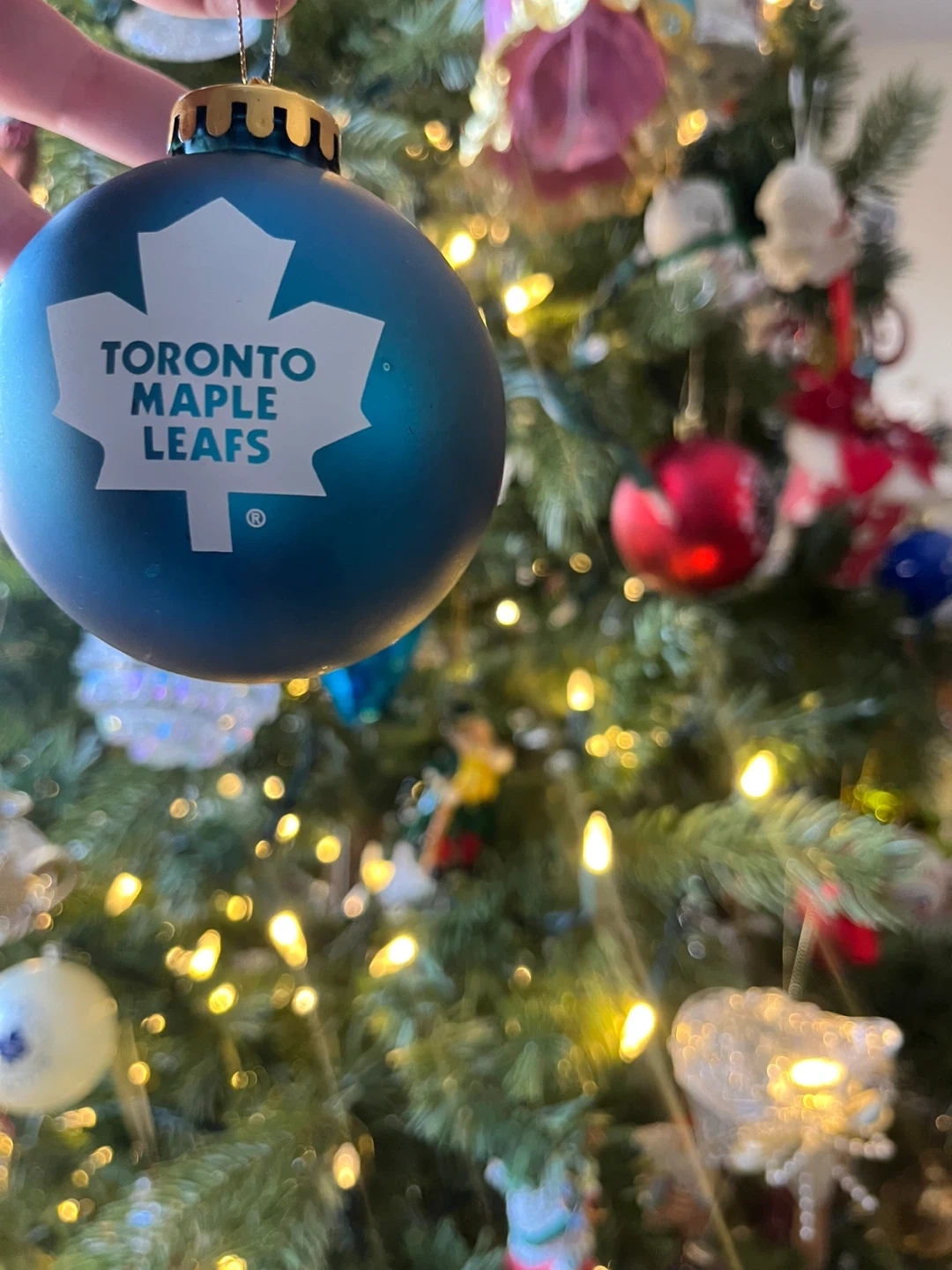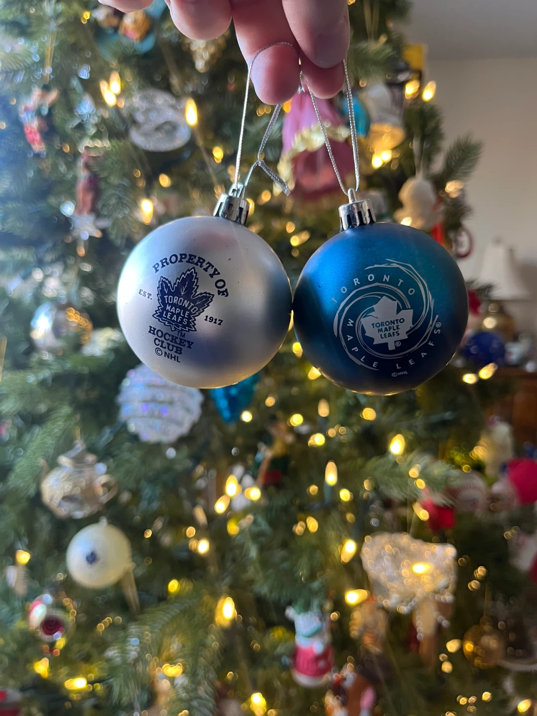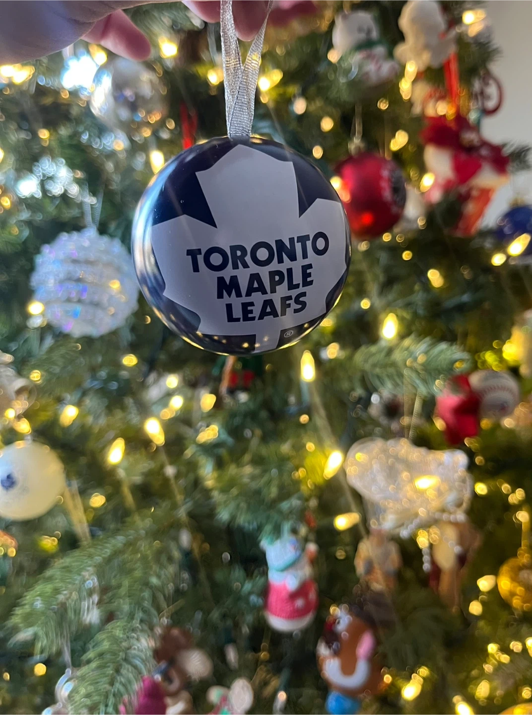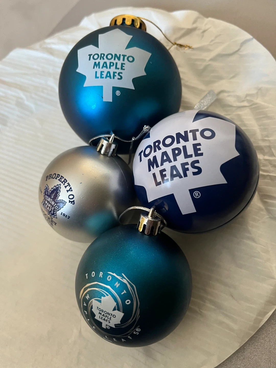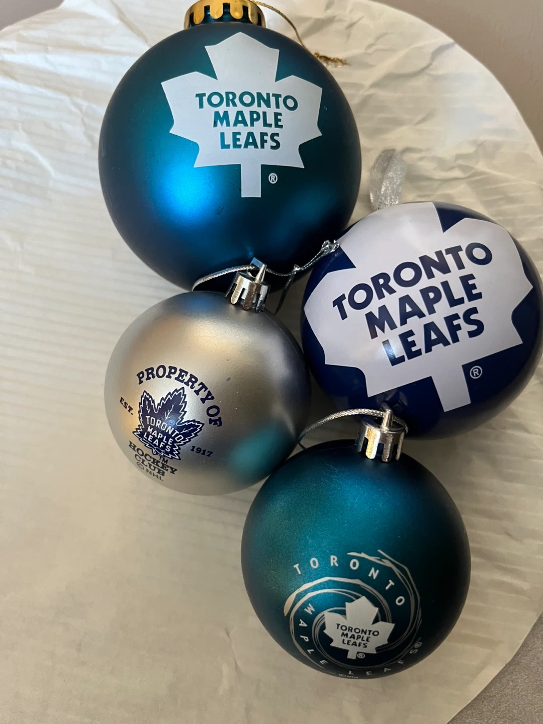 4 Toronto Maple Leafs Christmas balls, various sizes and designs. All feature logos on both the front and back except for the largest blue ball (logo only on front).