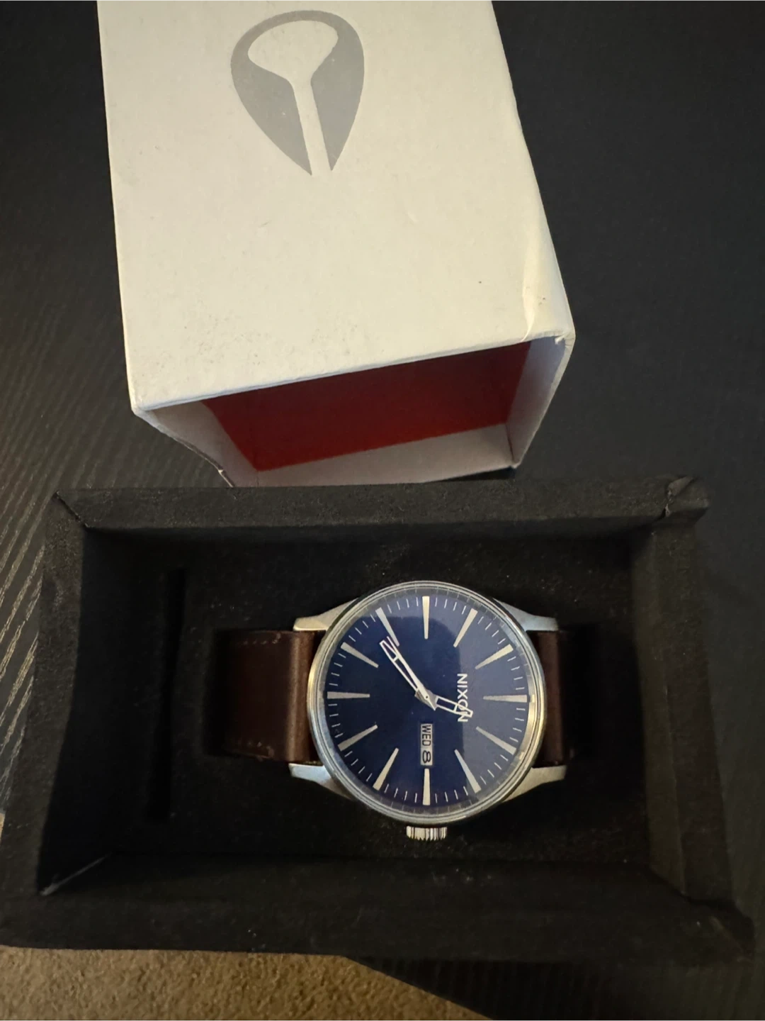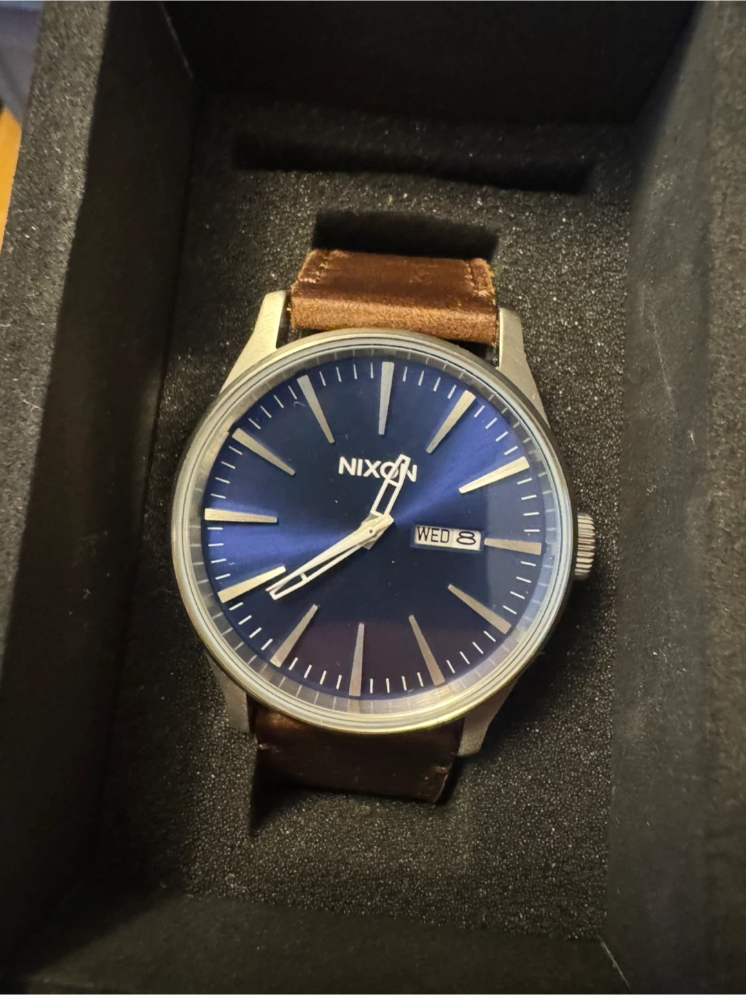 Selling a Nixon Time Teller watch with a stylish leather band! It comes in its original box. A great addition to any wardrobe!