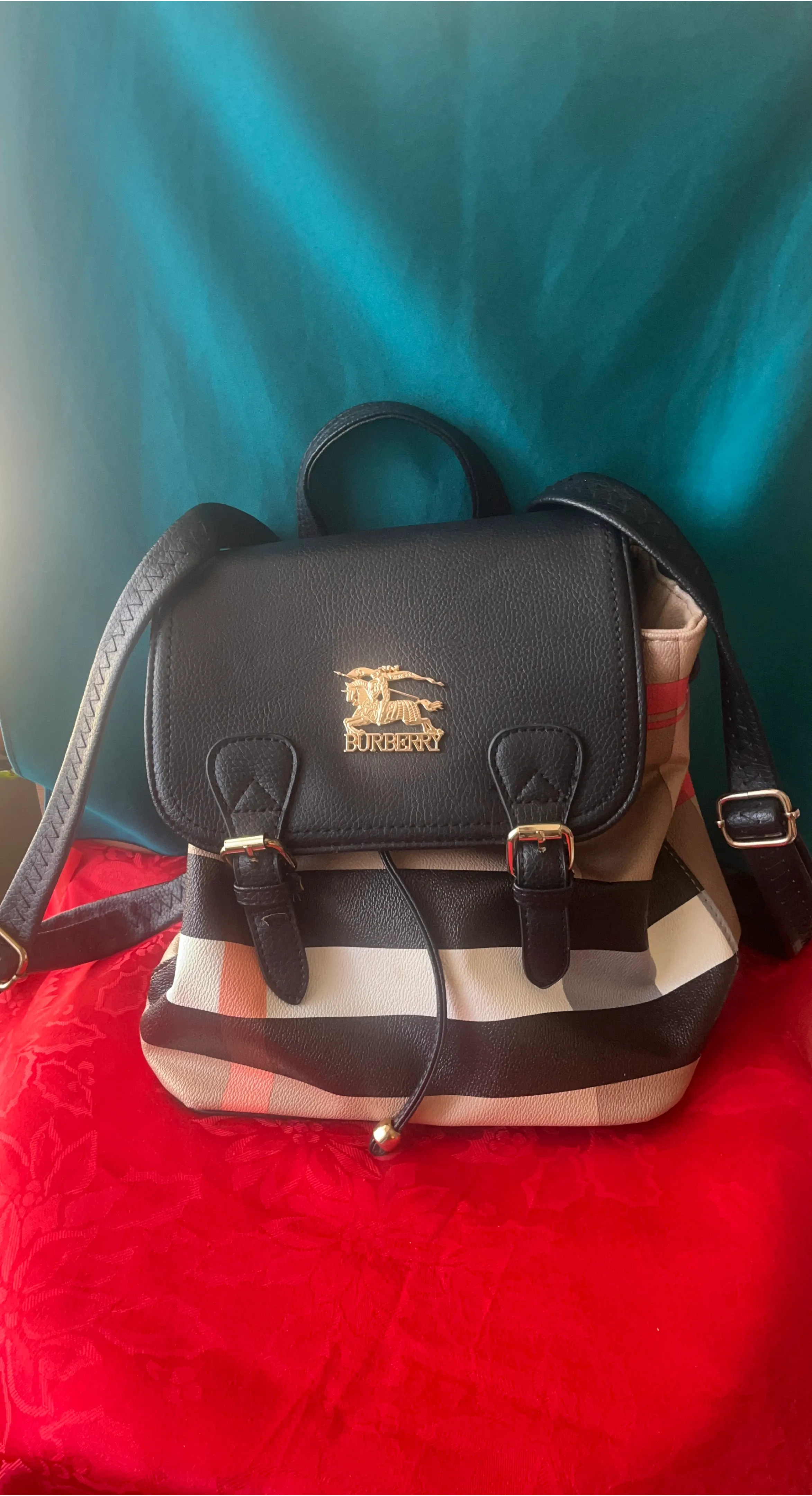 This is a cute Burberry-look backpack! It features a black leather flap and straps, with the classic Burberry check pattern on the main body of the bag. (It has Kate Hill written on the lining)