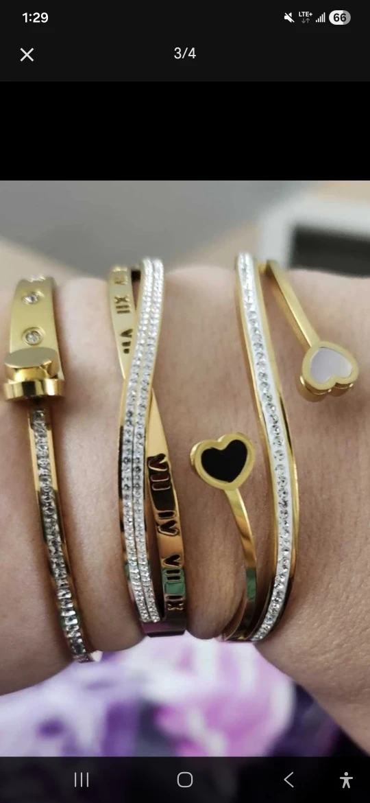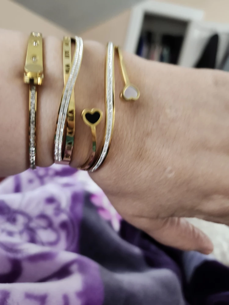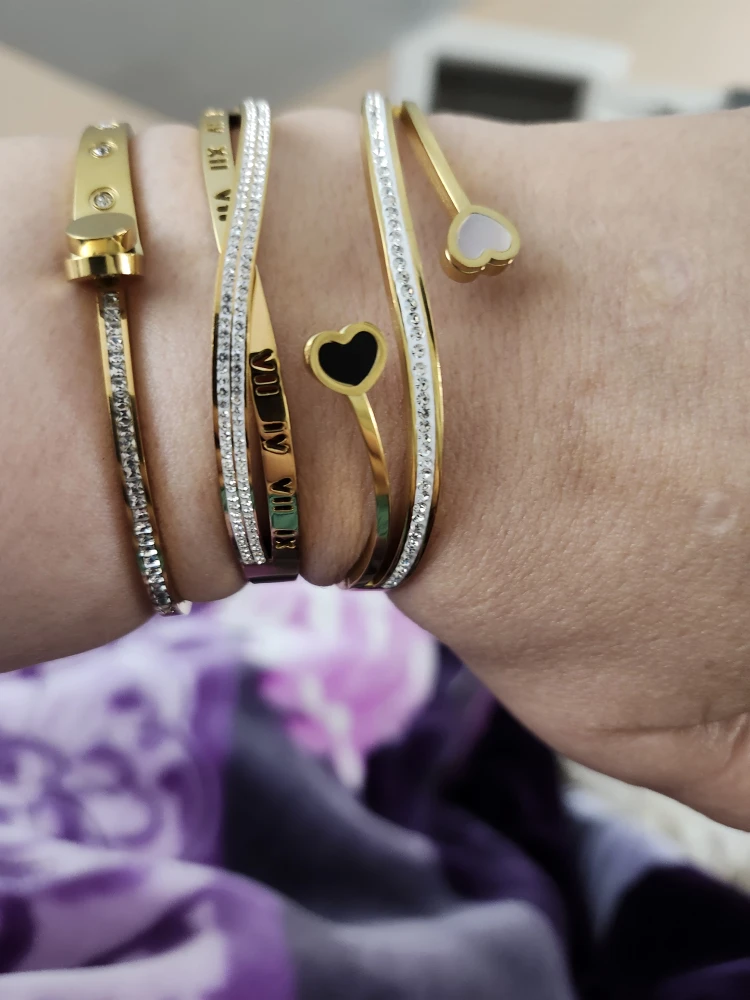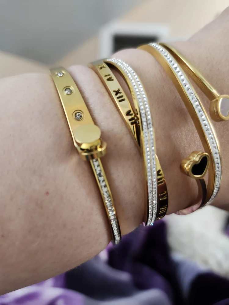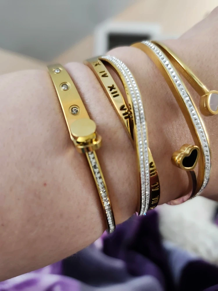 Here's a set of gold-tone bangle bracelets! They feature a variety of designs, including Roman numerals and heart accents. Perfect for adding a touch of sparkle to any outfit