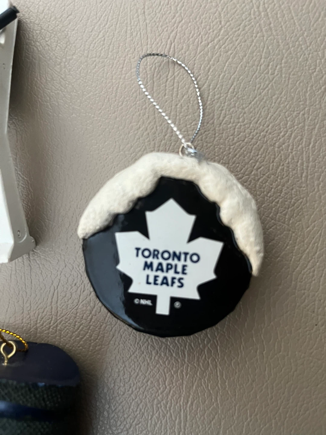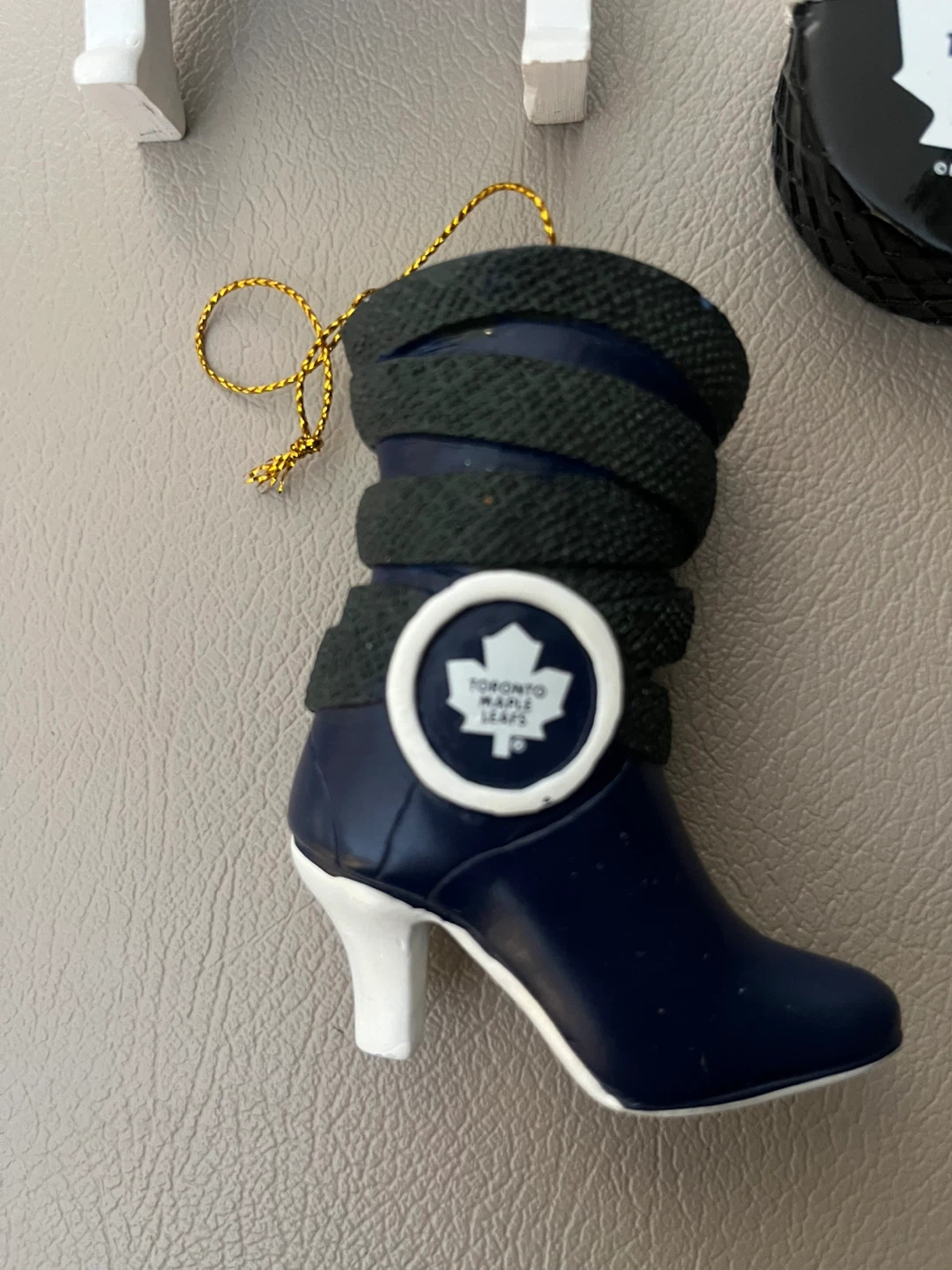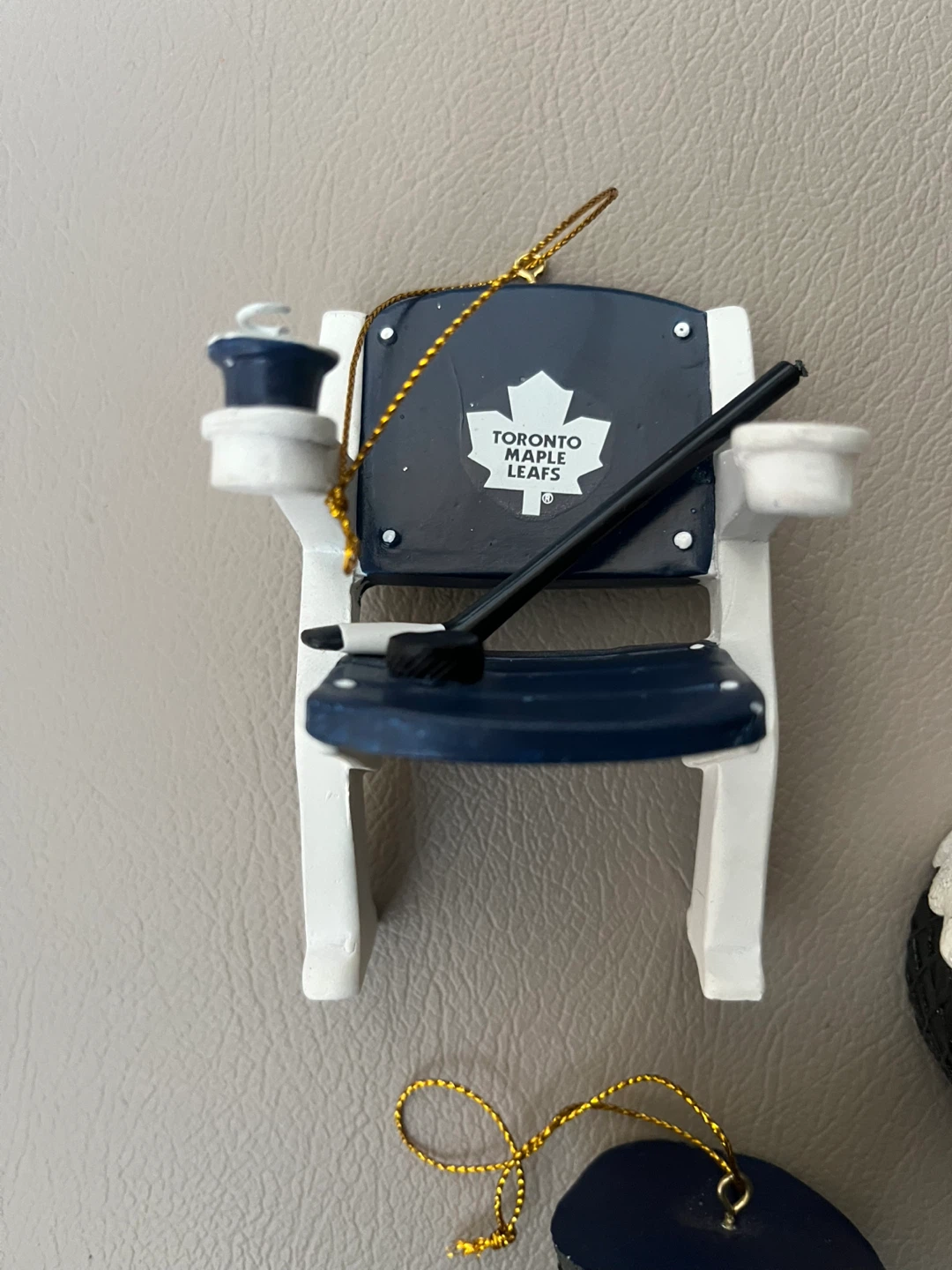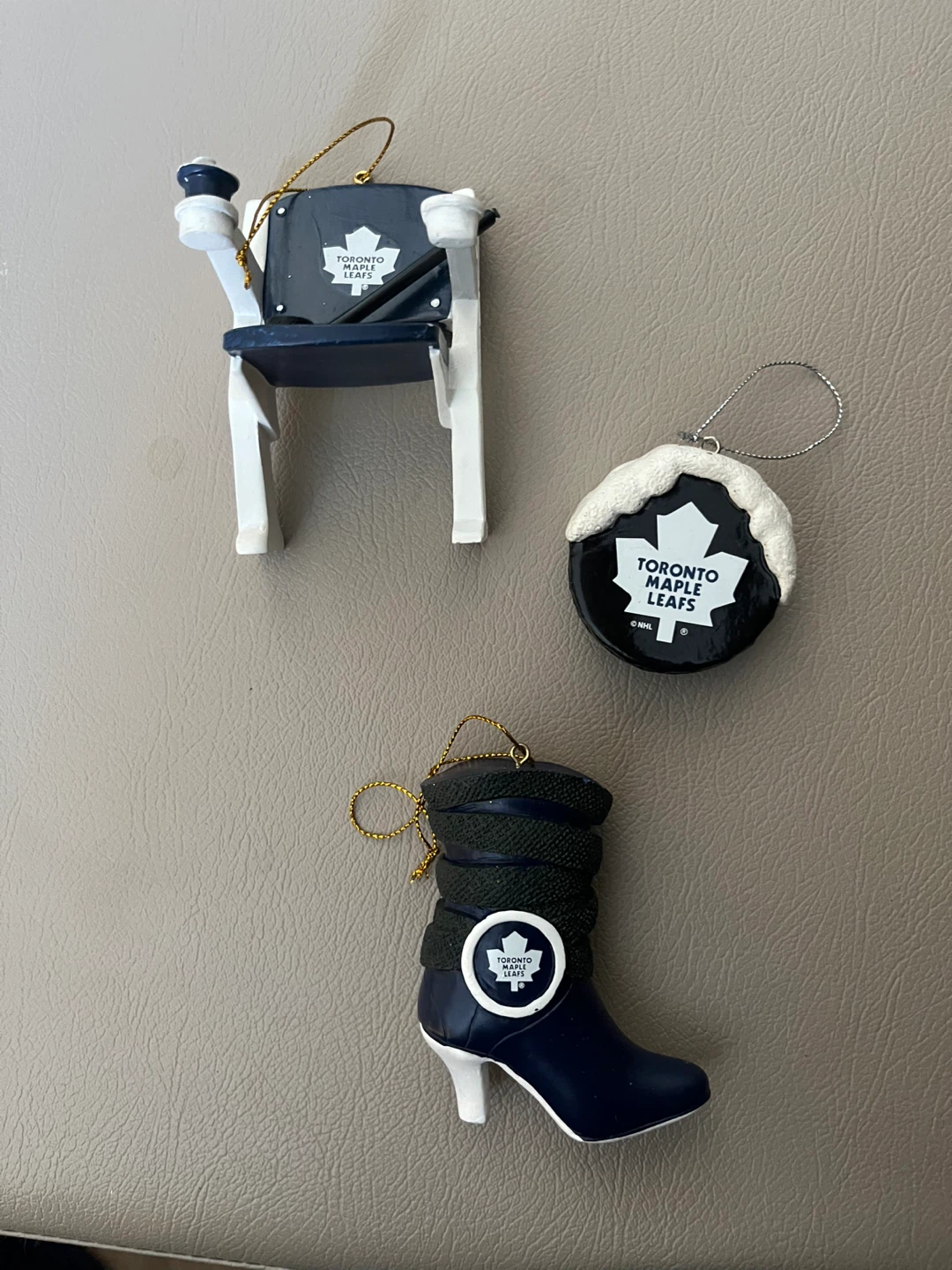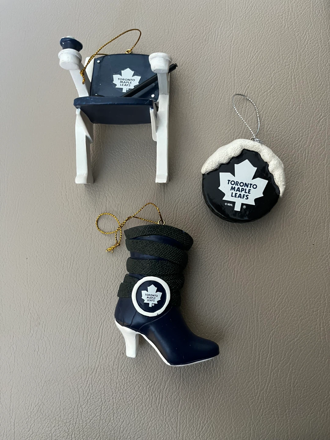 Set of 3 Toronto Maple Leafs Christmas tree ornaments. Features an arena seat, a snow covered puck, and a heeled boot.