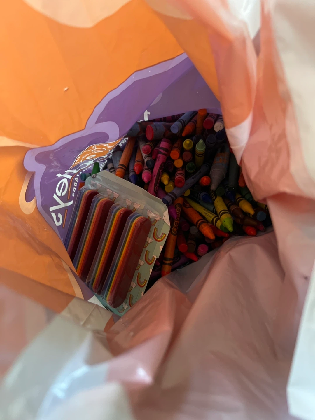 bag of Crayola crayons and rainbow erasers. There are many crayons in various colours, perfect for arts and crafts! Also included are rainbow erasers, still in their original packaging