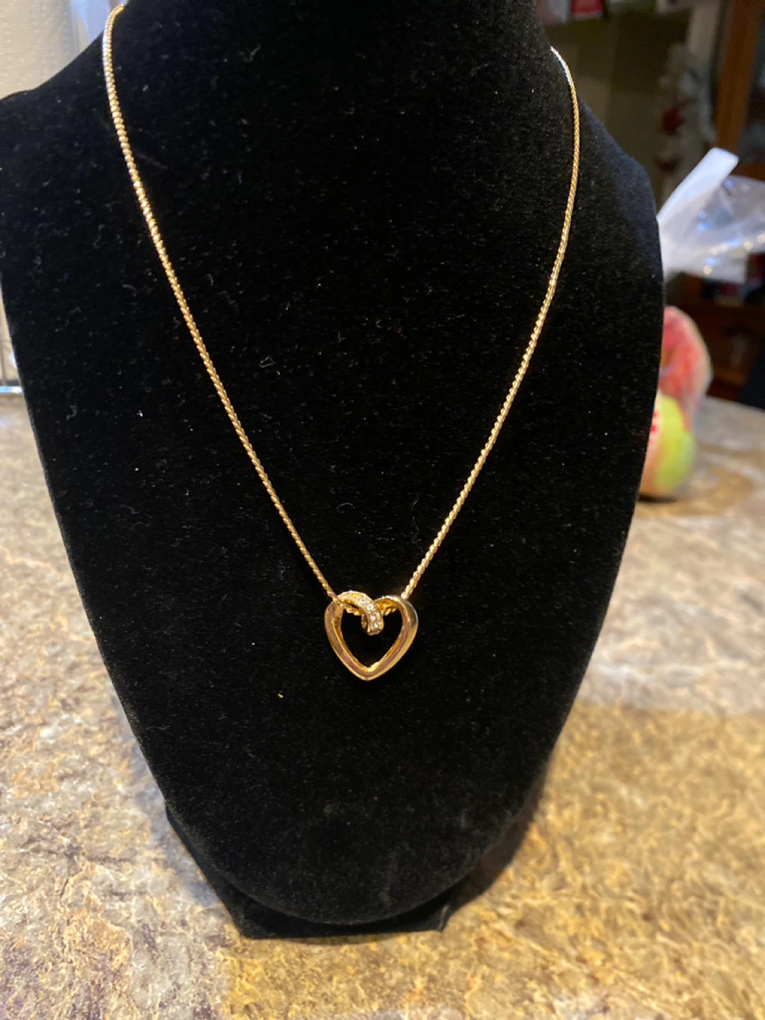 This is a lovely heart-shaped pendant on a delicate chain! The heart is gold-coloured, and it's in great condition. It would make a wonderful gift or a treat for yourself