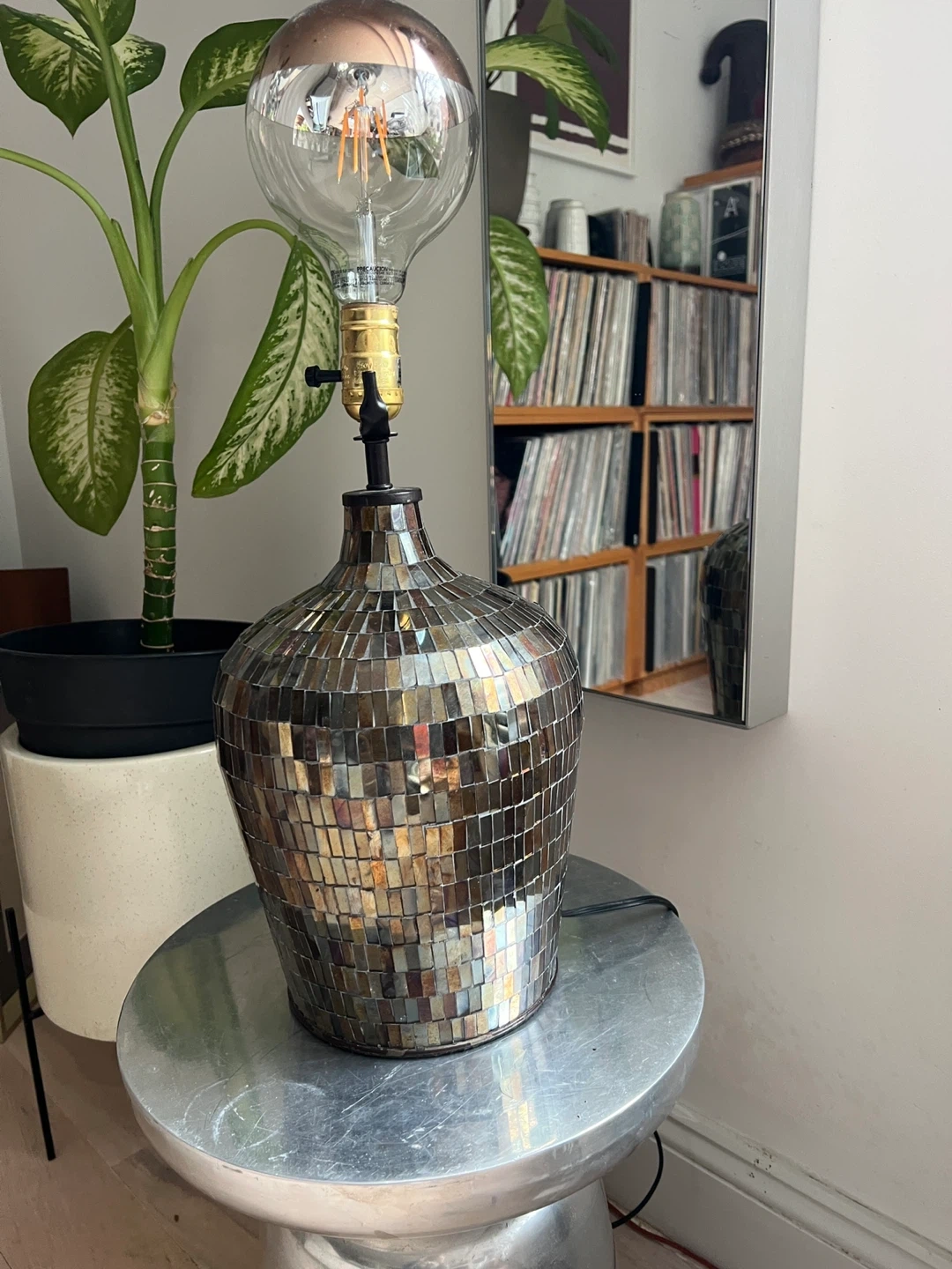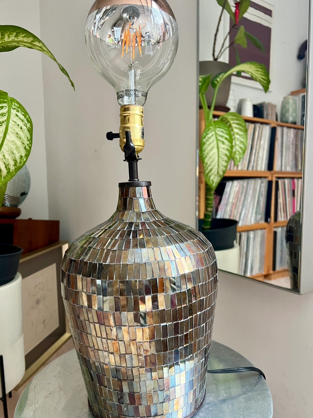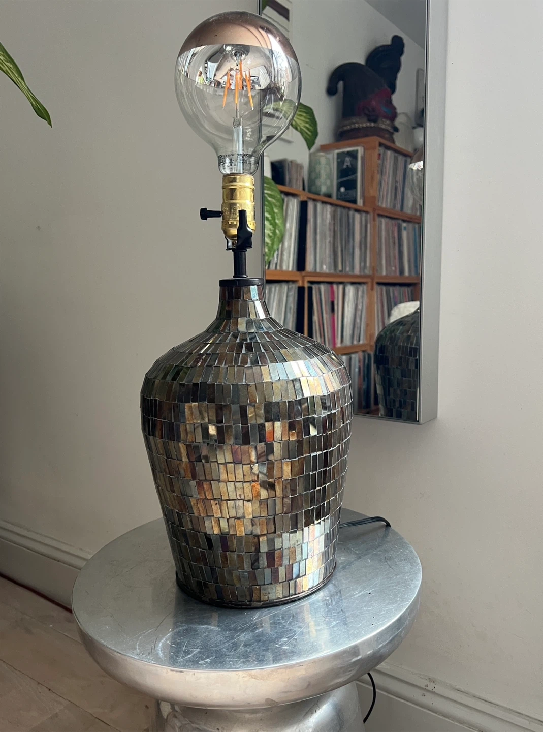 This is a beautiful mosaic tile table lamp that adds a touch of elegance to any room. The tiles create a unique and eye-catching design. It's in great condition , looks amazing with a larger Edison lightbulb type especially one that have sliver or gold on the top as it males the it look more sculptural. Pictures dont really do the mosaic justice , looks great in daylight as well.