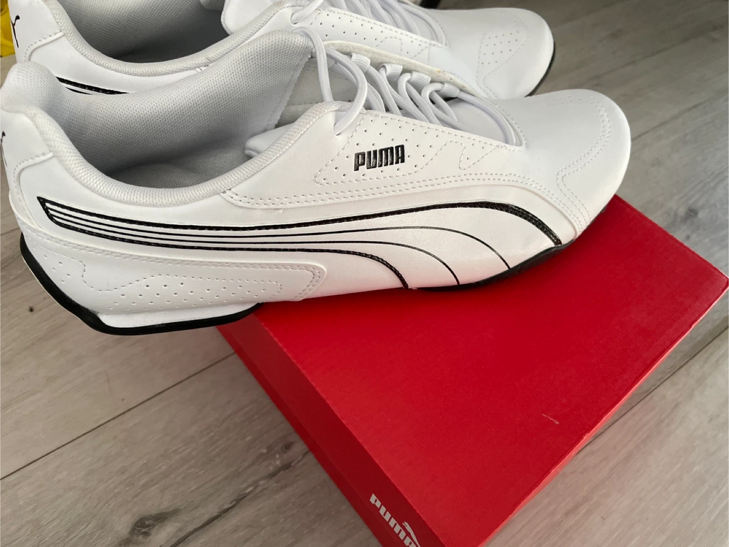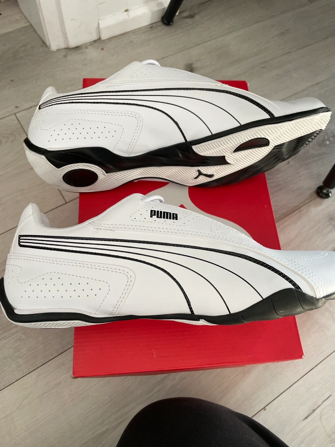 Selling a pair of brand new Puma driving shoes in white leather. They are in new condition and come with the original box. Size is 10.5 US.
