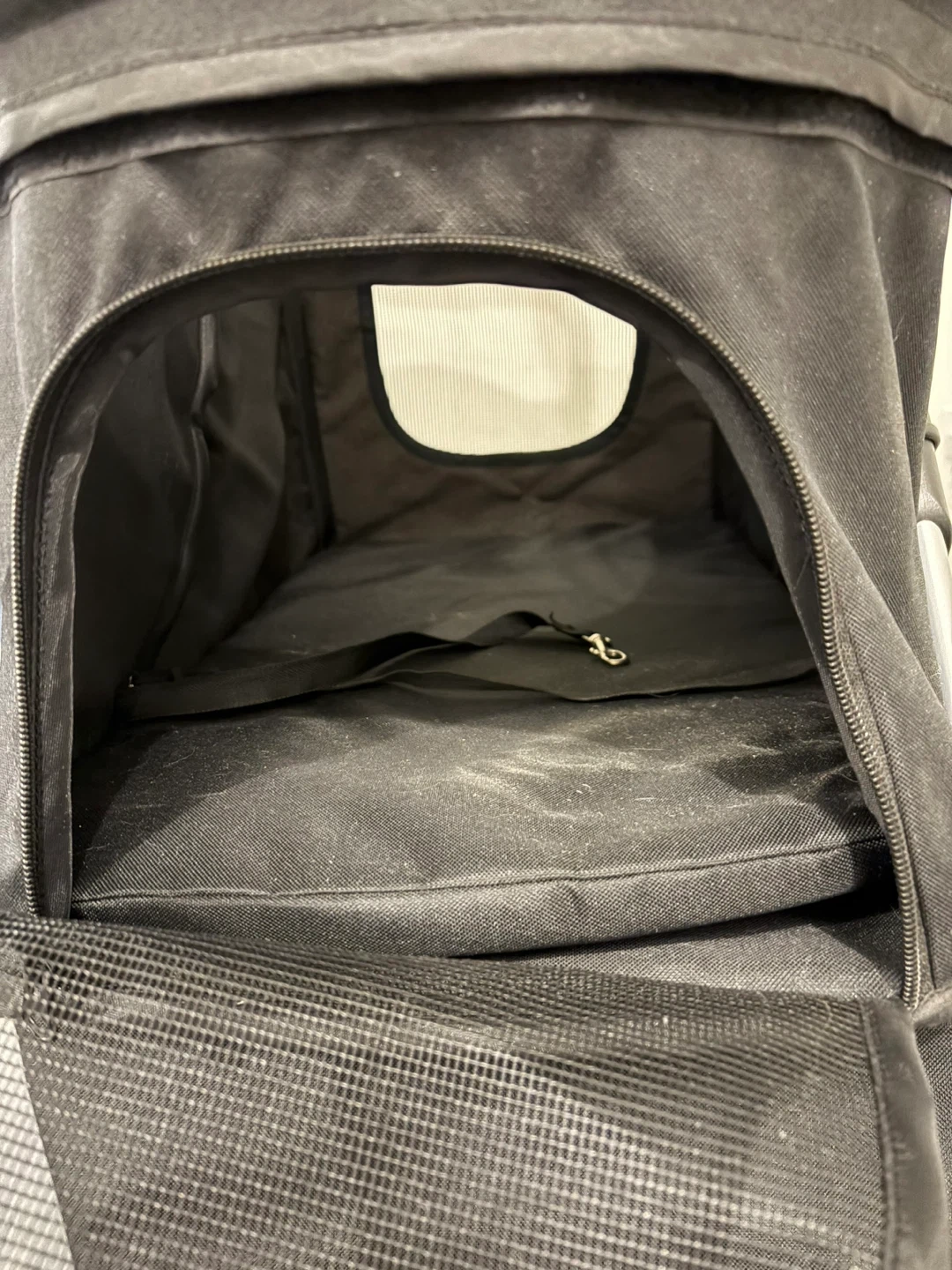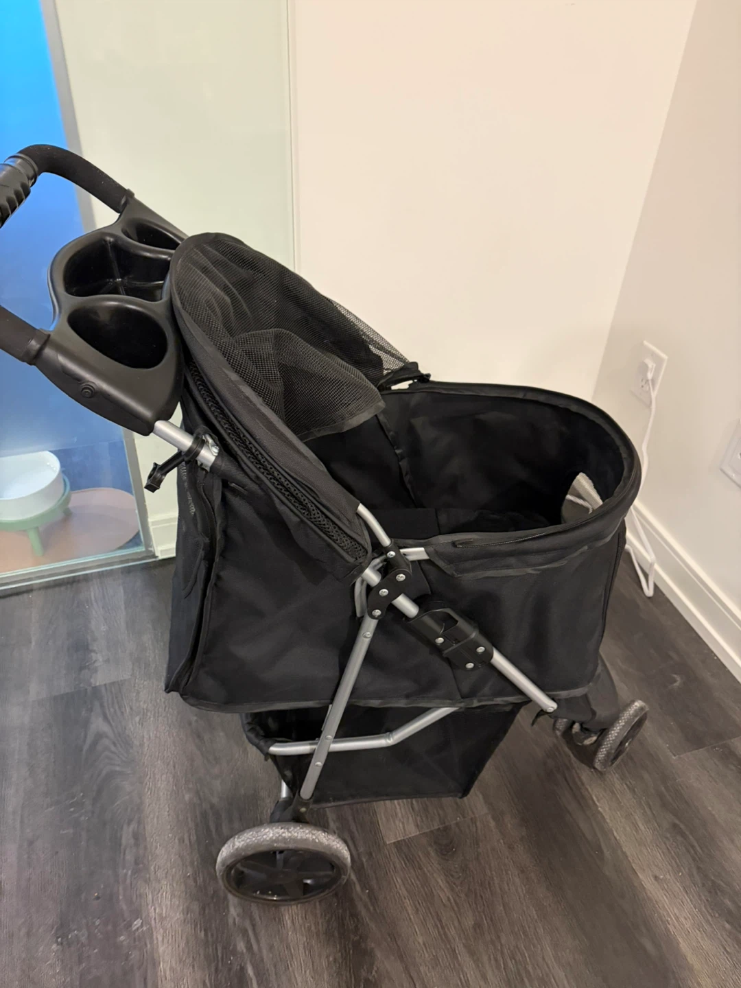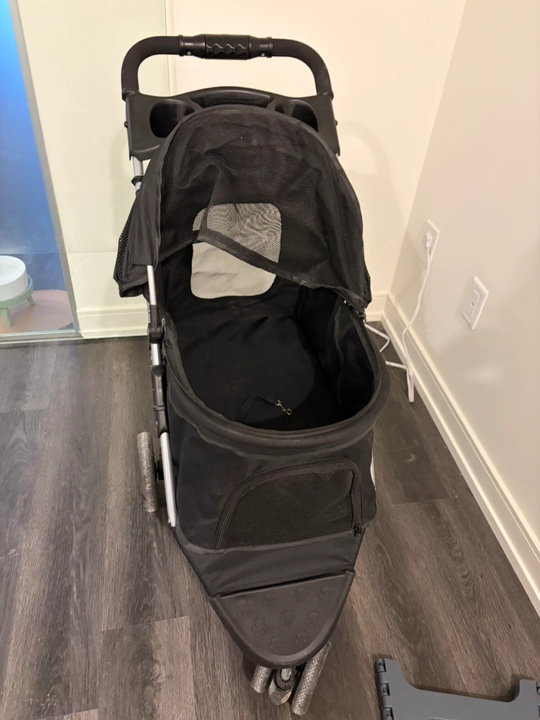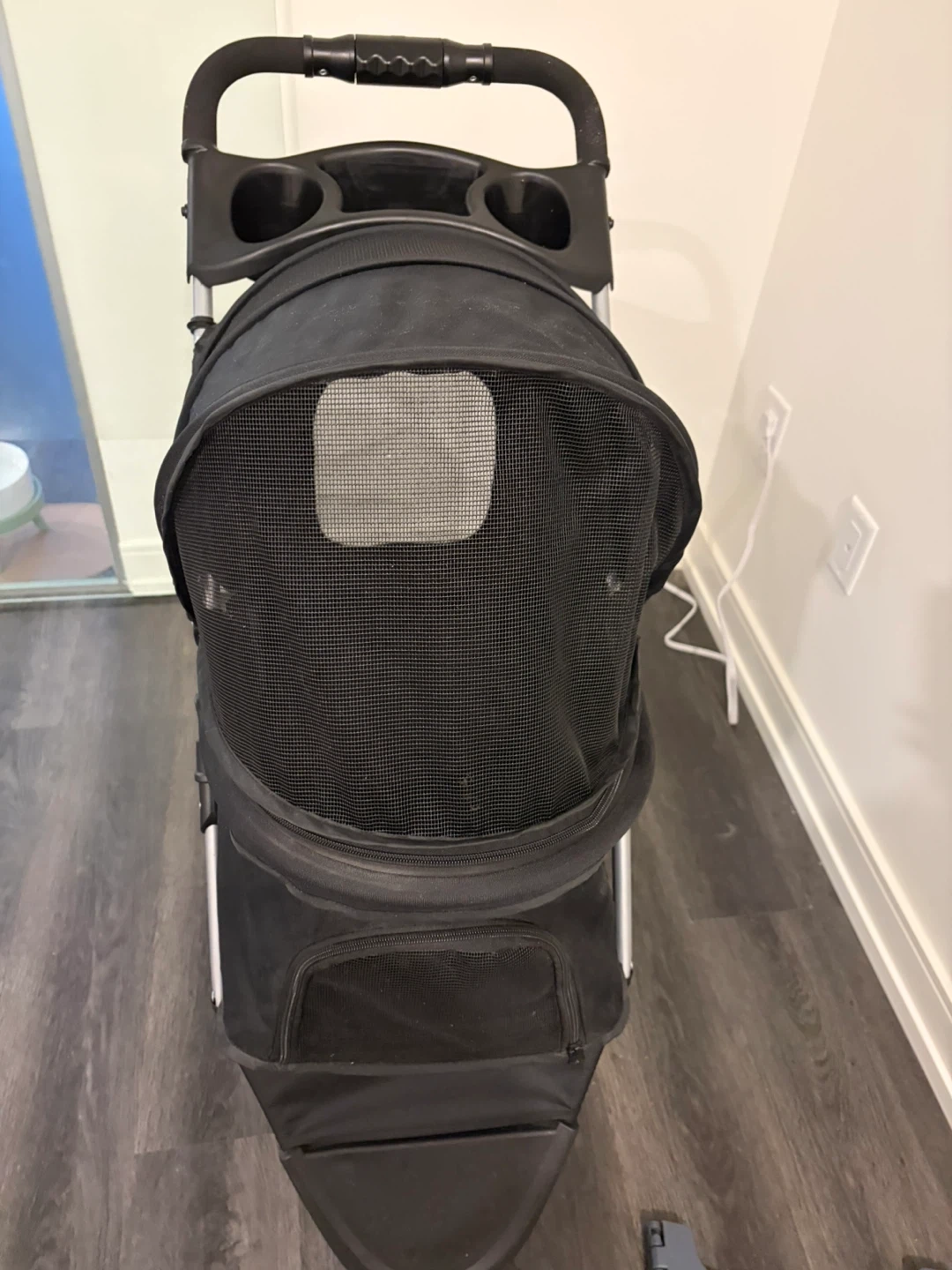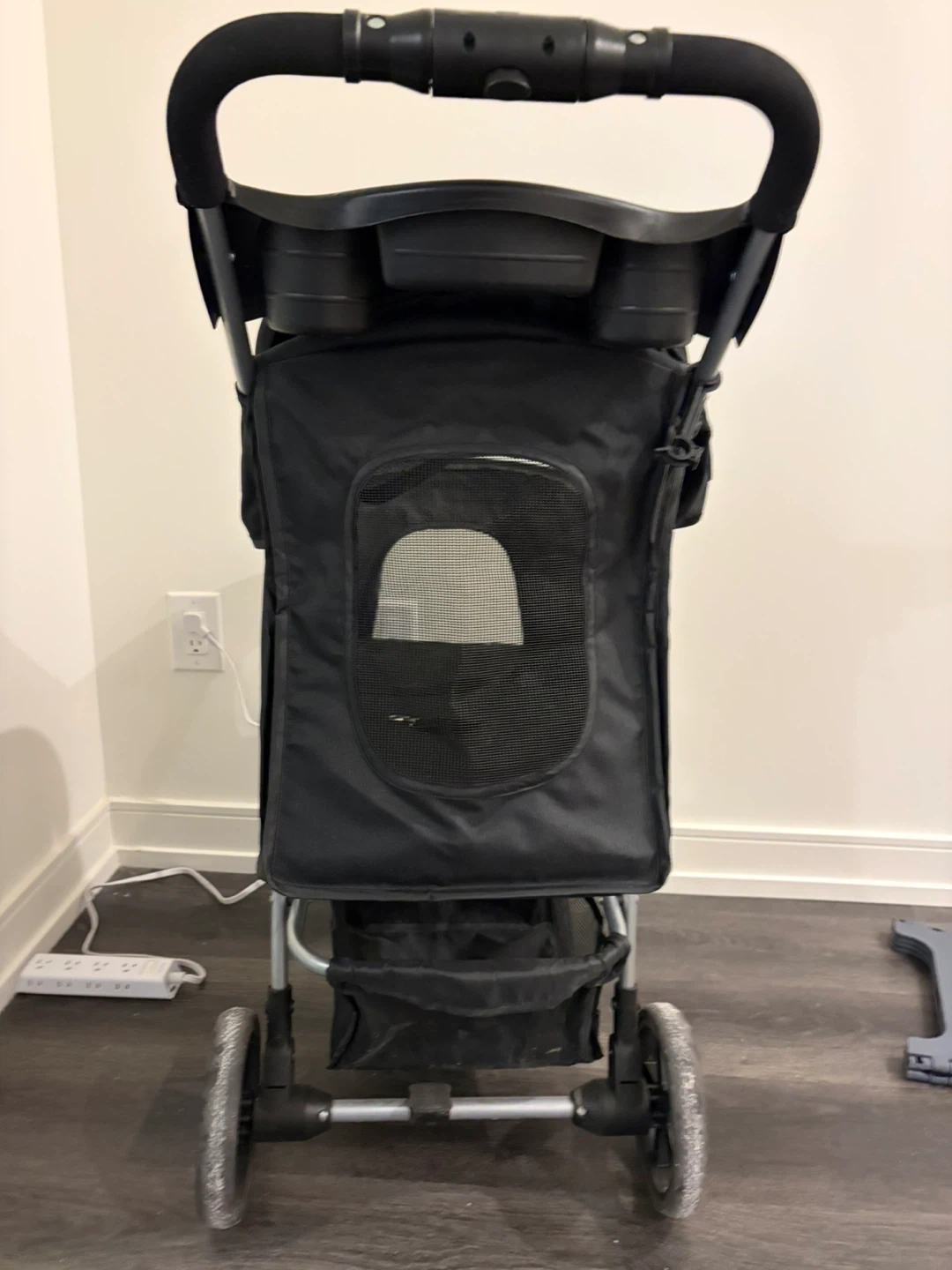 Selling a black pet stroller! It's in good condition and ready for walks around the neighbourhood. It has a mesh window, a handle for easy pushing, and a storage area underneath for your belongings. Perfect for small dogs or cats!