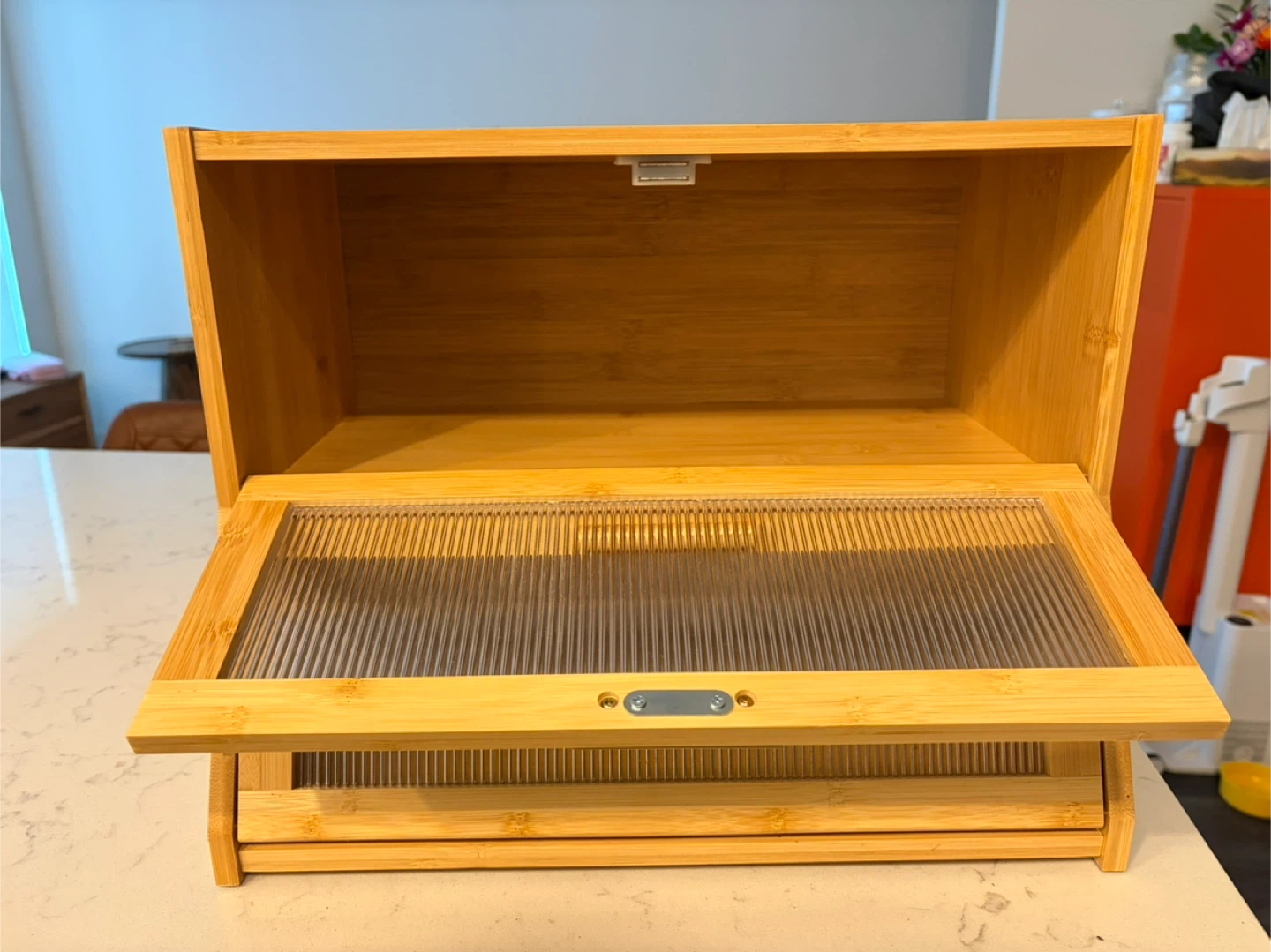 Here's a handy bamboo bread box to keep your baked goods fresh! It has two clear doors so you can easily see what's inside.