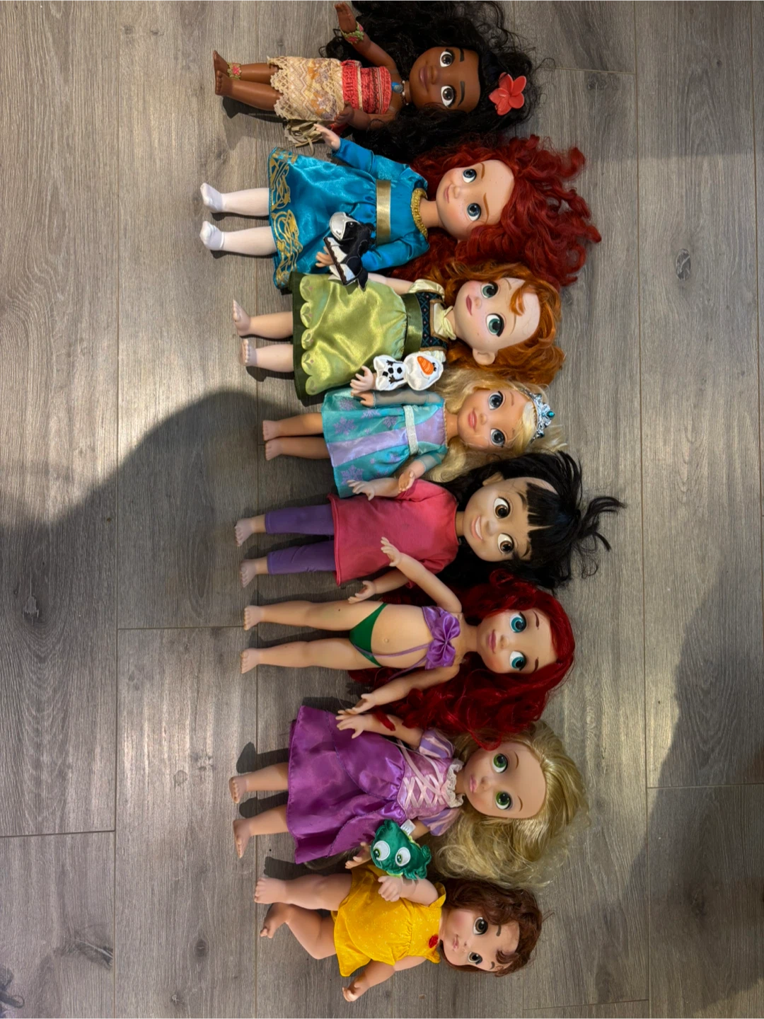 Selling a collection of 8 Disney Princess dolls! Includes Moana, Merida, Anna, Elsa, Boo, Ariel, Rapunzel, Bell.
