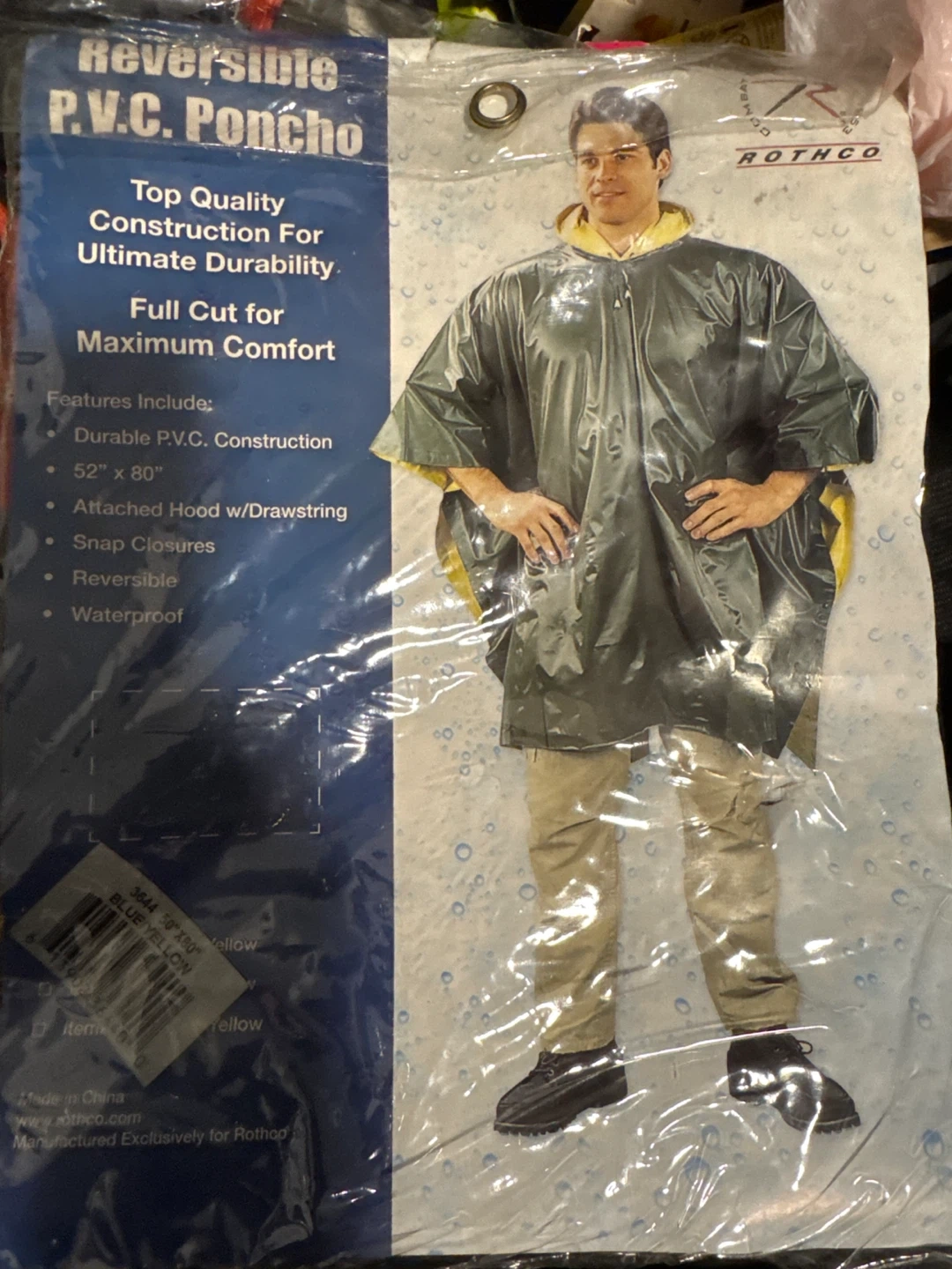 Selling a Rothco reversible PVC poncho. It's full cut for maximum comfort and features durable PVC construction. It also includes an attached hood with a drawstring and snap closures. The poncho is waterproof and measures 52" x 80"