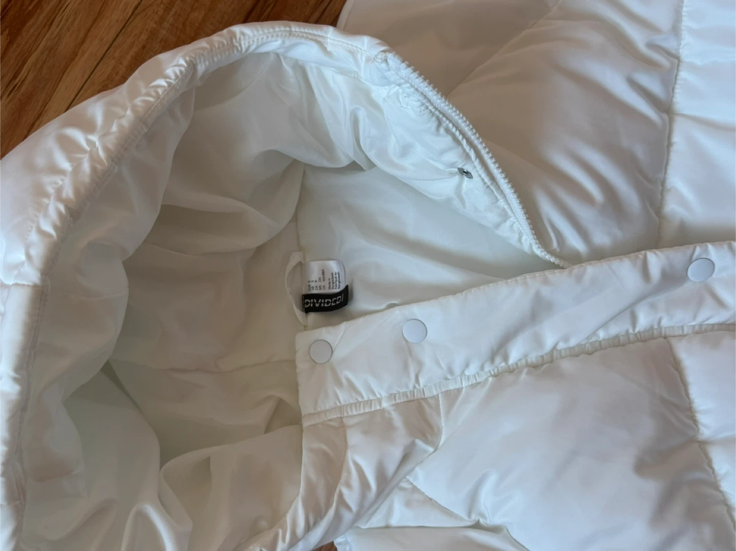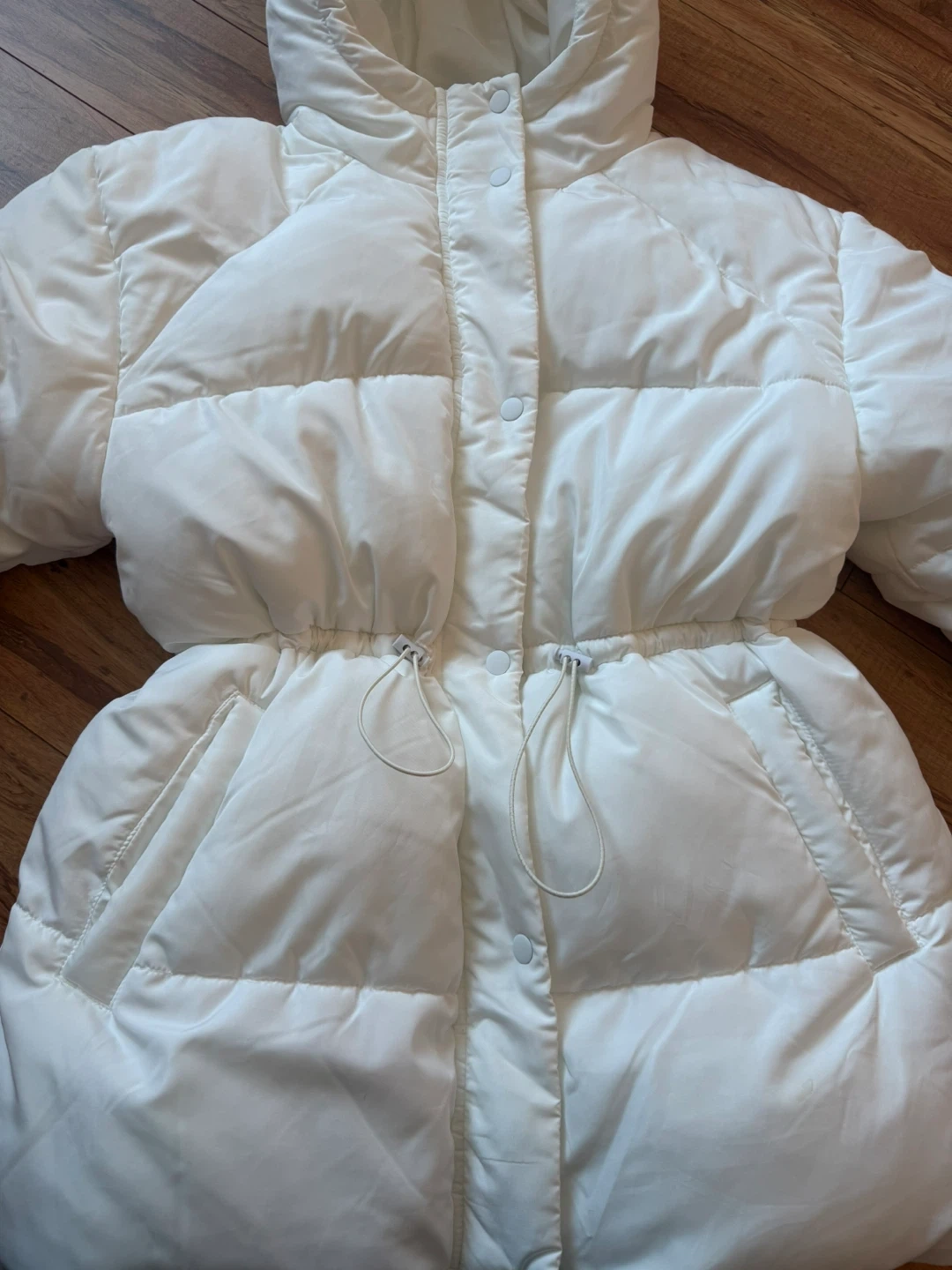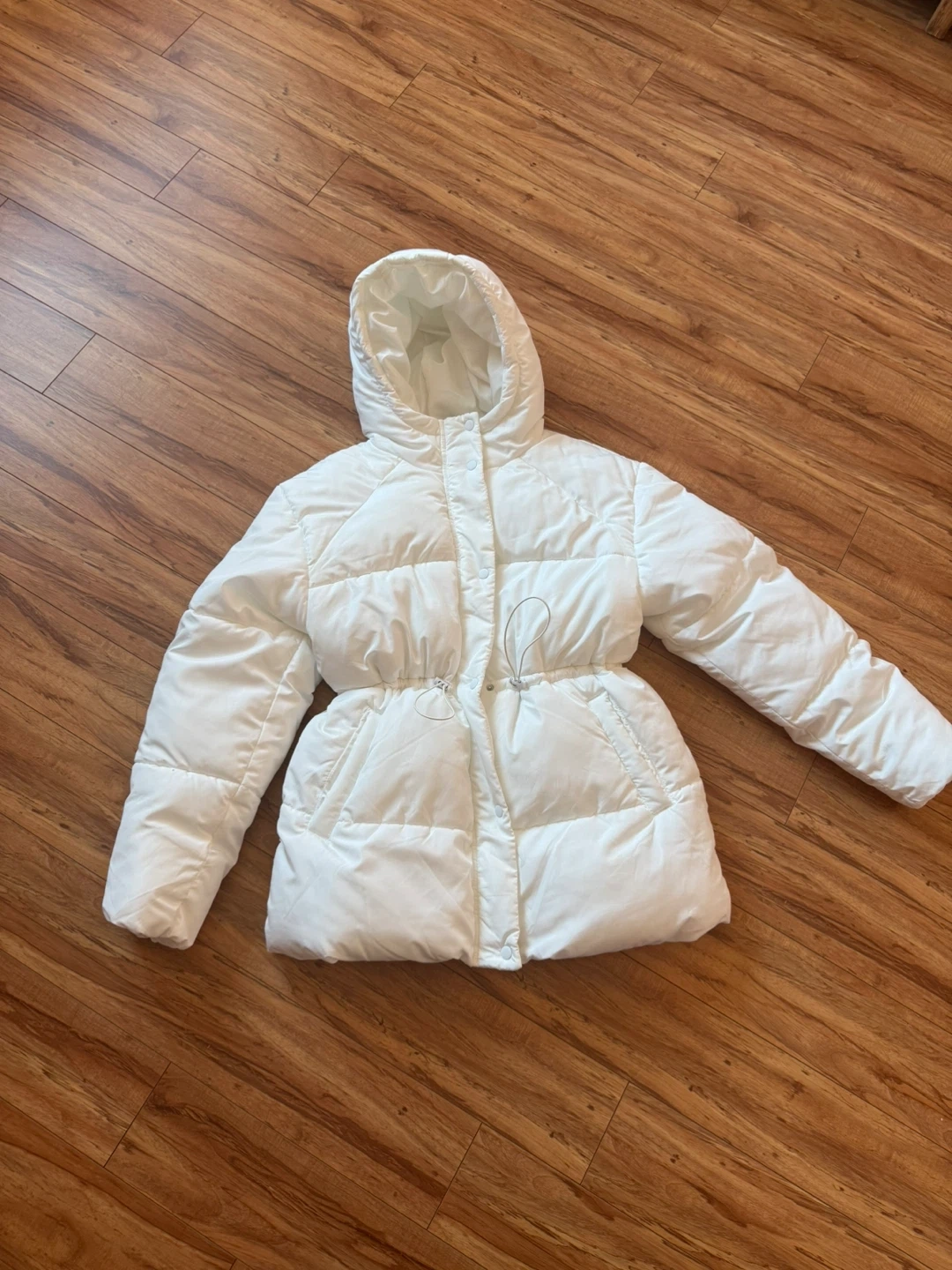 Selling a cozy white puffer jacket from H&M's Divided line! It's in great condition and perfect for staying warm during those chilly days. Originally bought for 90 bucks