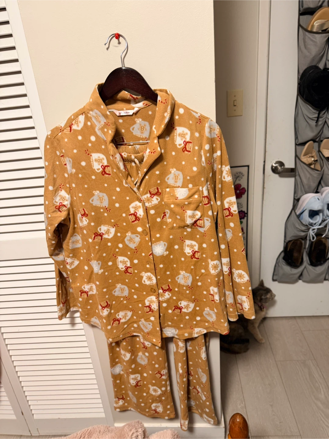 Here's a cozy Women's Gingerbread Latte and Pancakes pajama set! It's a cute golden-brown colour with a pattern of coffee cups and snowflakes. Perfect for the winter season