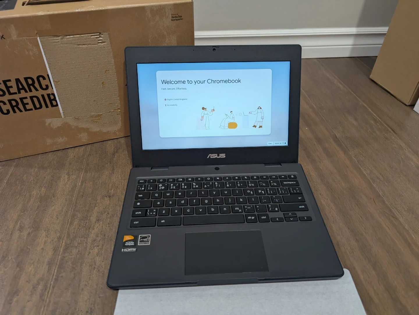Brand new Asus Chromebook 11.6” inch laptop for sale. 11.6” inch HD display, MediaTek Kompanio 520 processor, 1M cache up to 2.0GHz 8 cores, 64GB eMMC storage, LPDDR4x 4GB RAM, Wifi 6, Bluetooth 5.3, ChromeOS, USB 3.2 ports, HDMI, lightweight, HD webcam camera with privacy shutter, military standards spill resistant keyboard, rubber line edges and corners, $200 FIRM.