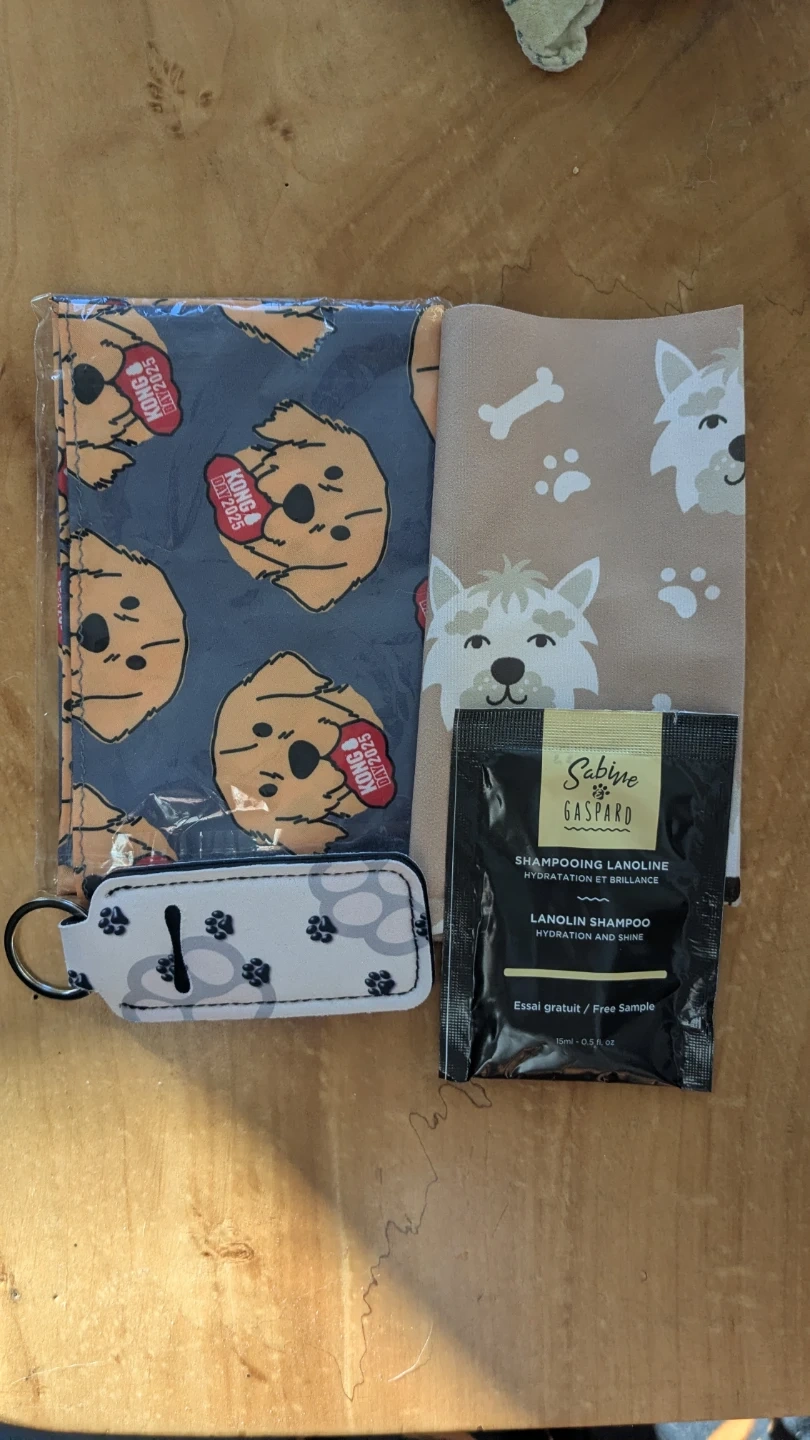A little gift pack for your pup, all products are new and unused/unopened! Includes 2 dog bandanas, a dog shampoo sample, and a keychain for poop bags!