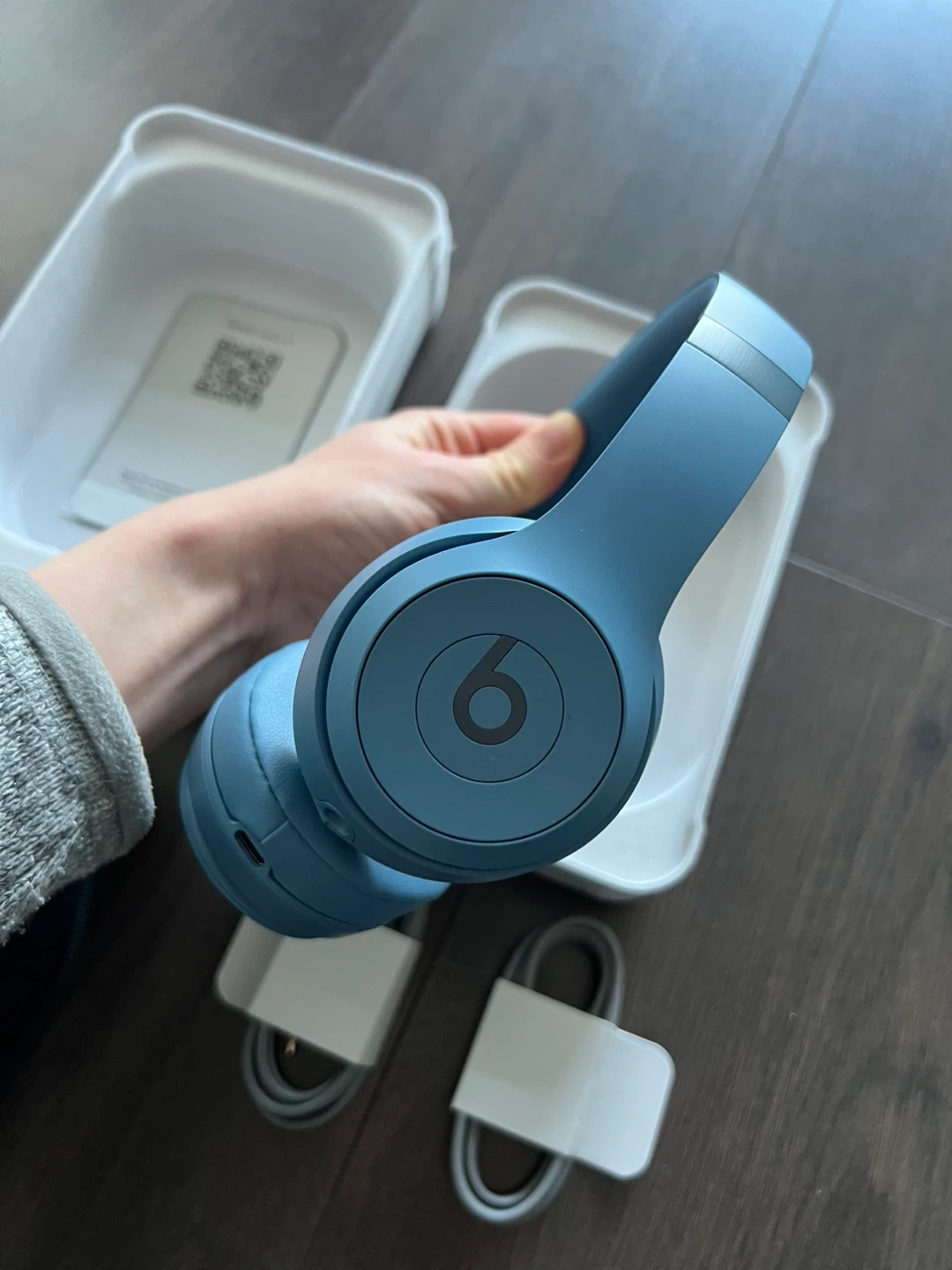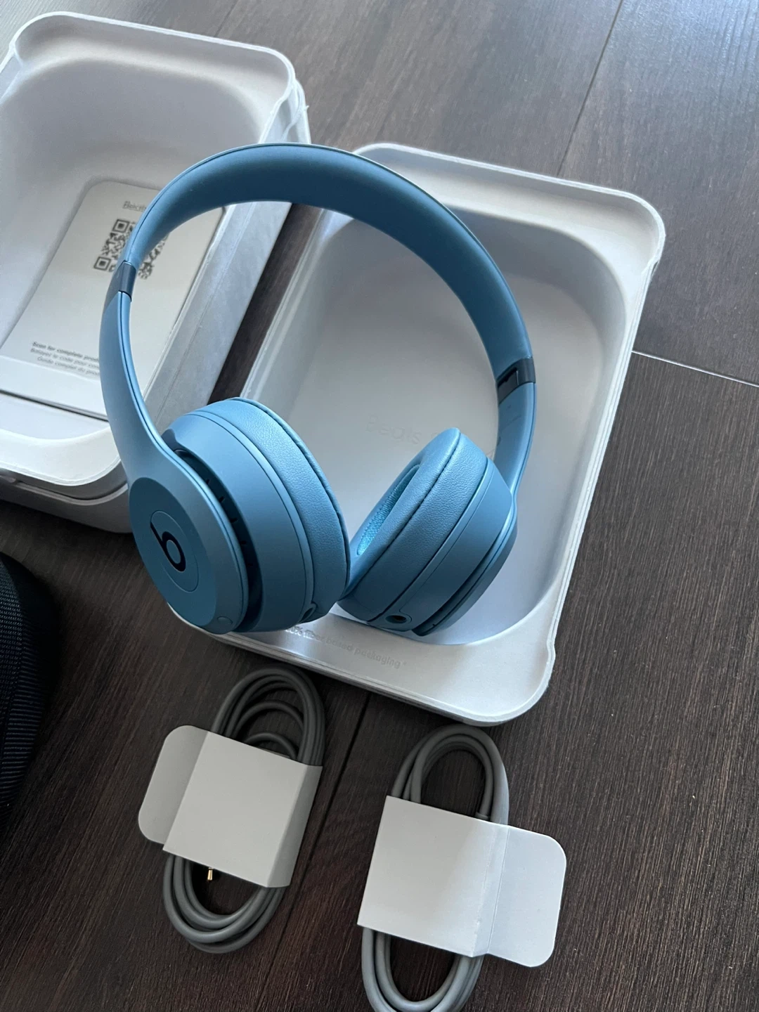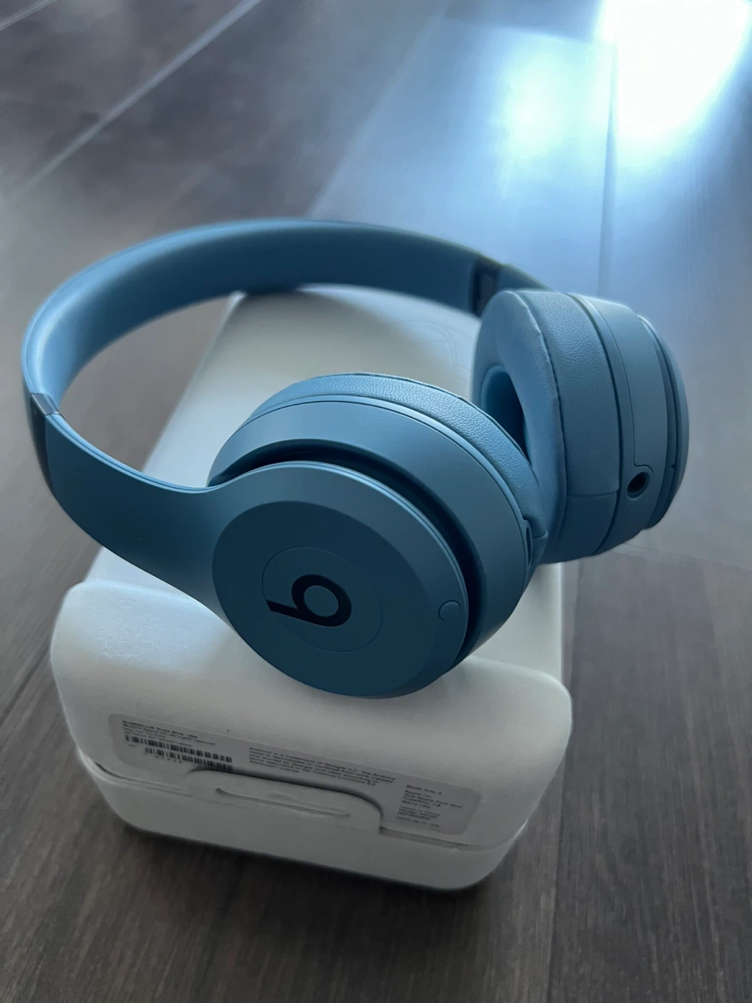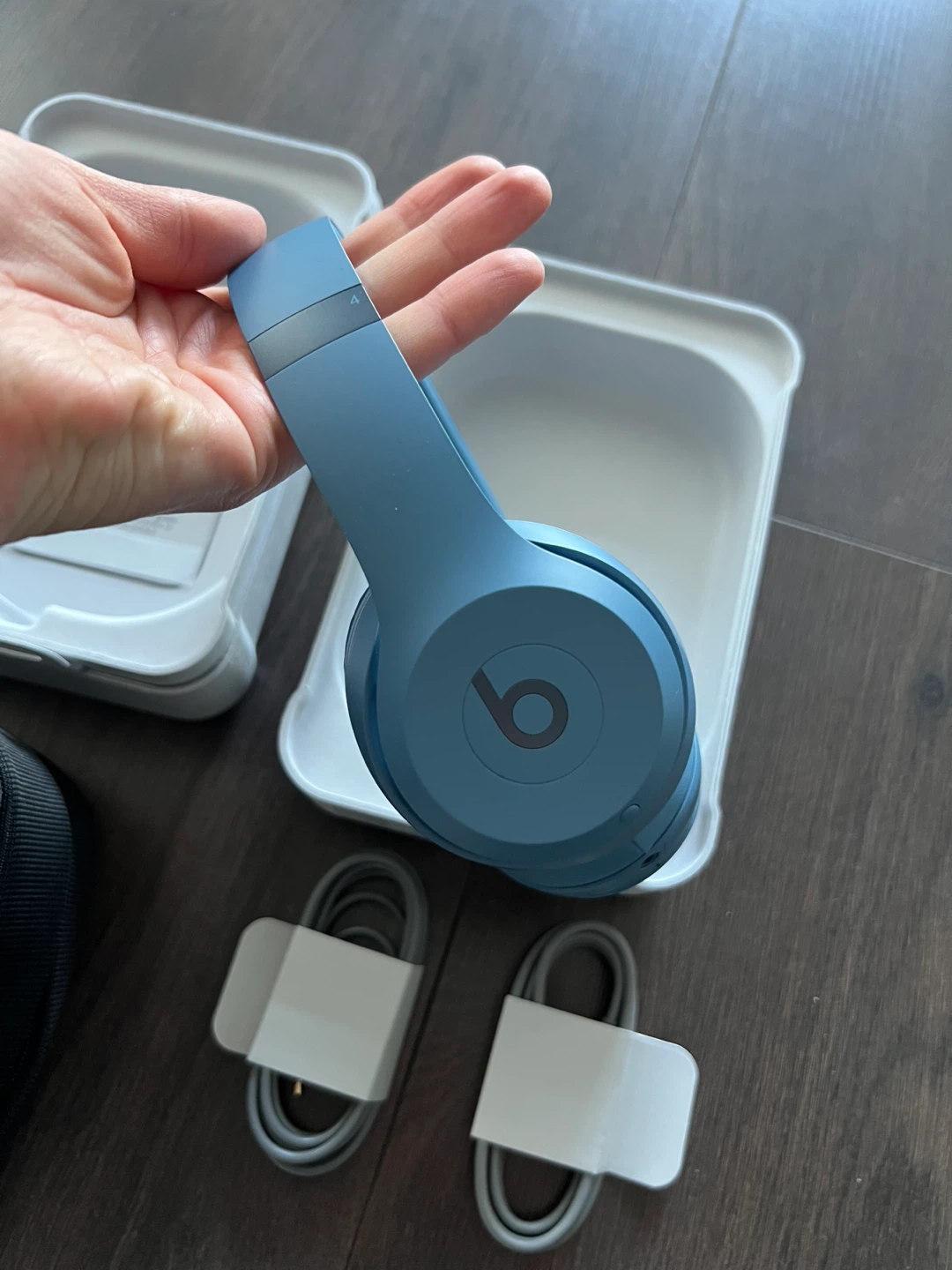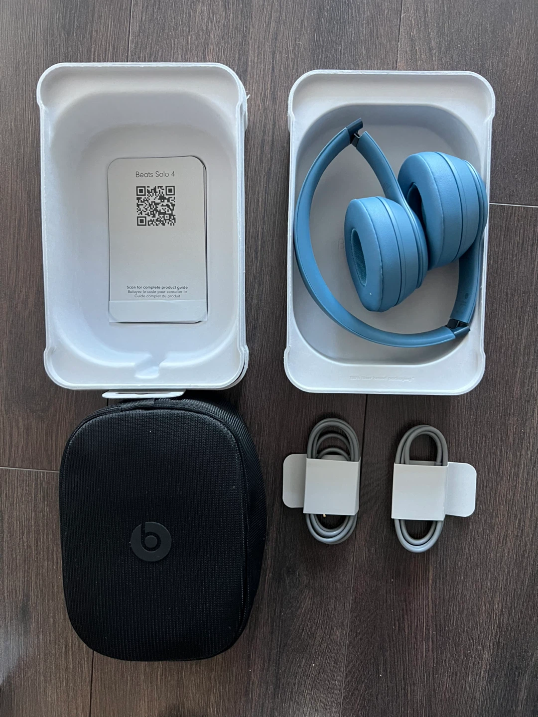 Selling a pair of Beats Solo 4 wireless headphones in blue! They're new (open box) and come with the original box and included components, including the case and two cables
