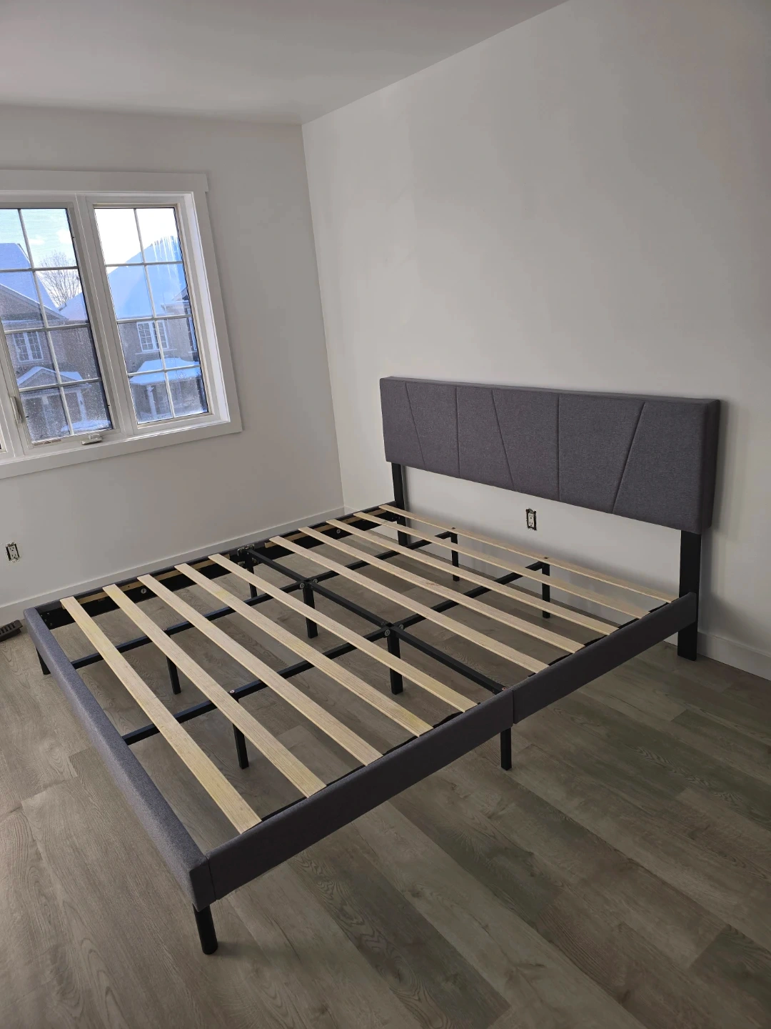 Selling a bed frame with a grey fabric finish. It's in great condition and ready for a new home. The frame is sturdy and provides good support for your mattress. Perfect for adding a touch of modern style to your bedroom!
