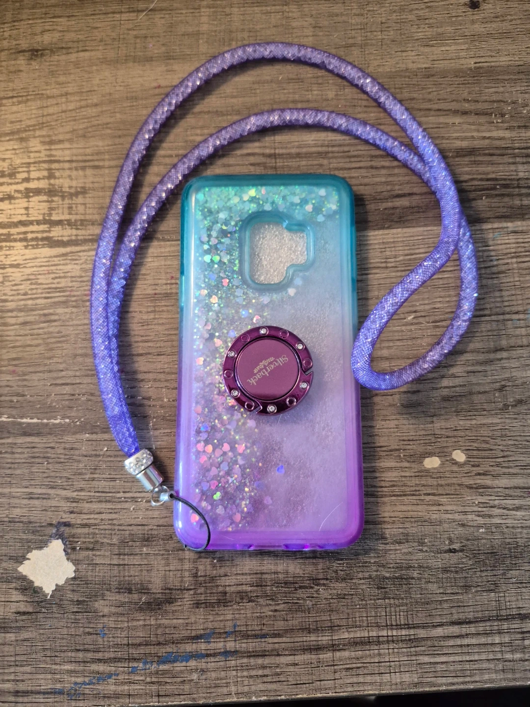 Selling a cute Silverback phone case with a lanyard. The case has a glittery design and a purple phone ring. It's in great condition and ready for a new phone!