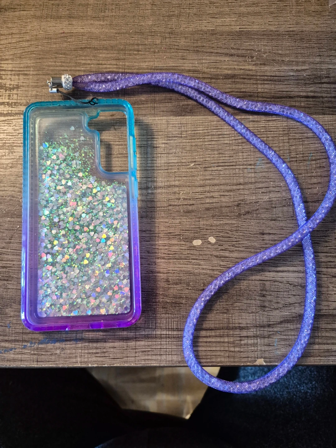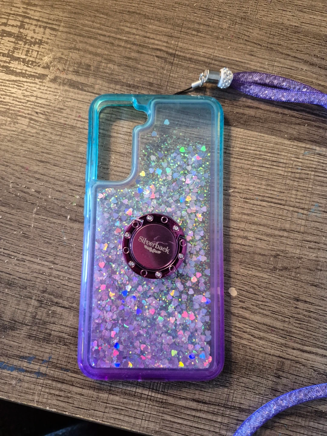 Selling a cute phone case with a lanyard! It has a glittery, ombre design that fades from blue to purple. The case also features a built-in Silverback ring stand for easy grip and hands-free viewing