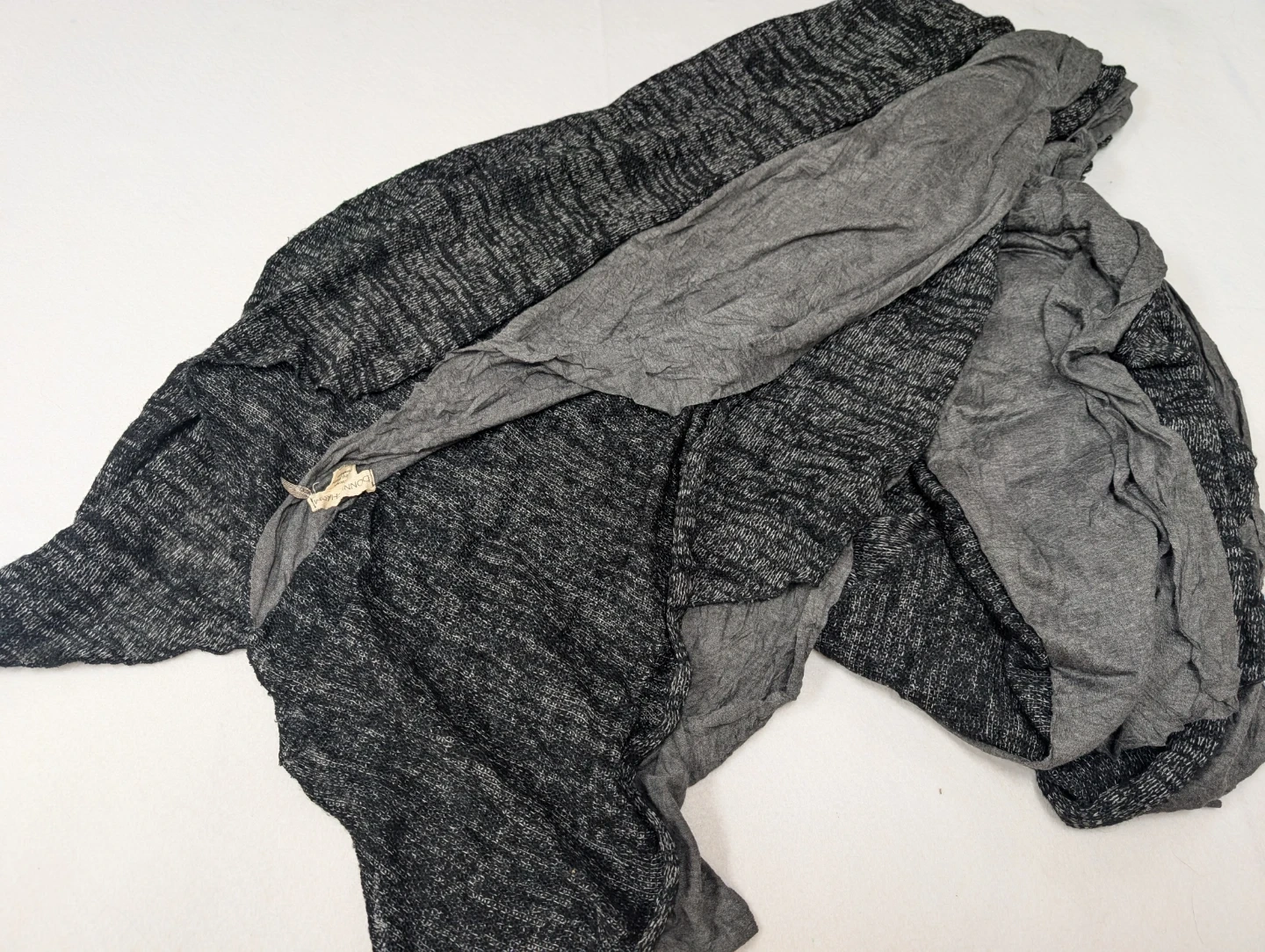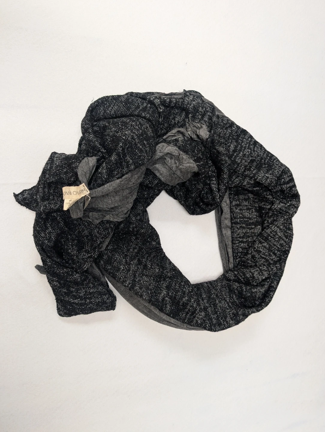Selling a DONNI.CHARM scarf in a mix of grey tones! It's made of 80% cotton and 20% wool, making it a cozy and stylish accessory for any outfit