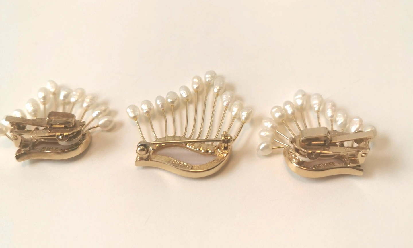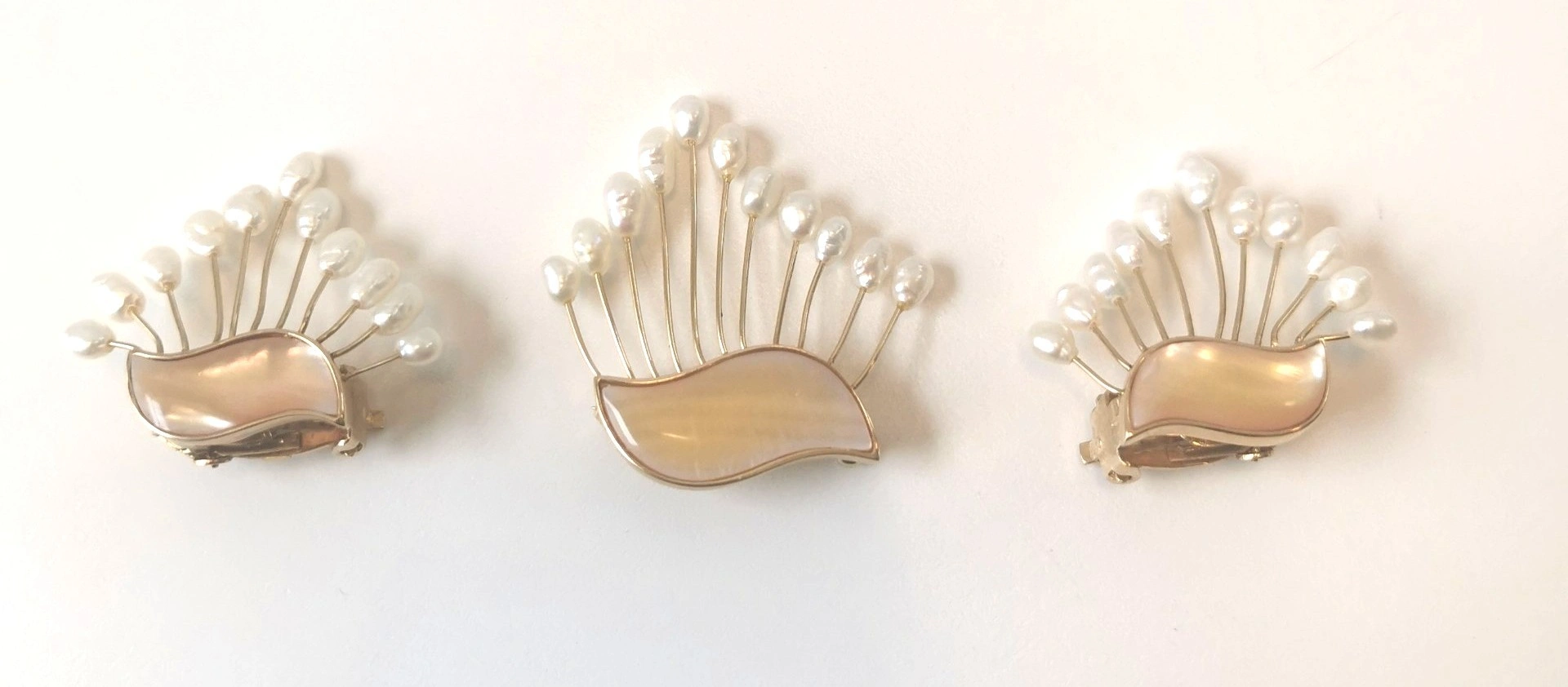 This set includes a matching brooch/pin and a pair of clip-on earrings.