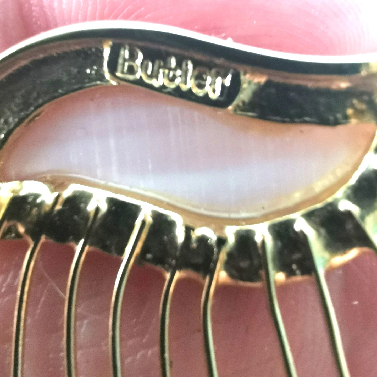 Condition: Good vintage condition light wear. Signed 'BUTLER' on the back of the brooch. The pin and clip mechanisms are in good working order.Materials: Gold-tone metal, genuine Mother-of-Pearl, and faux pearls.