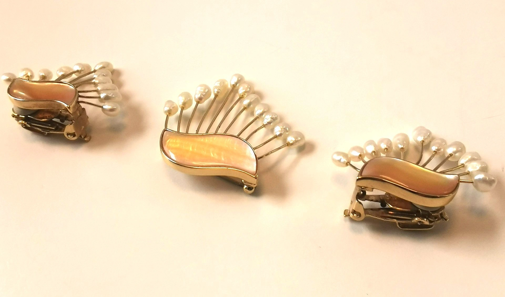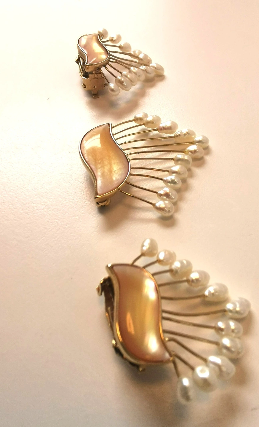 Butler Vintage Brooch and Clip On Earrings: Mother of Pearl 80s