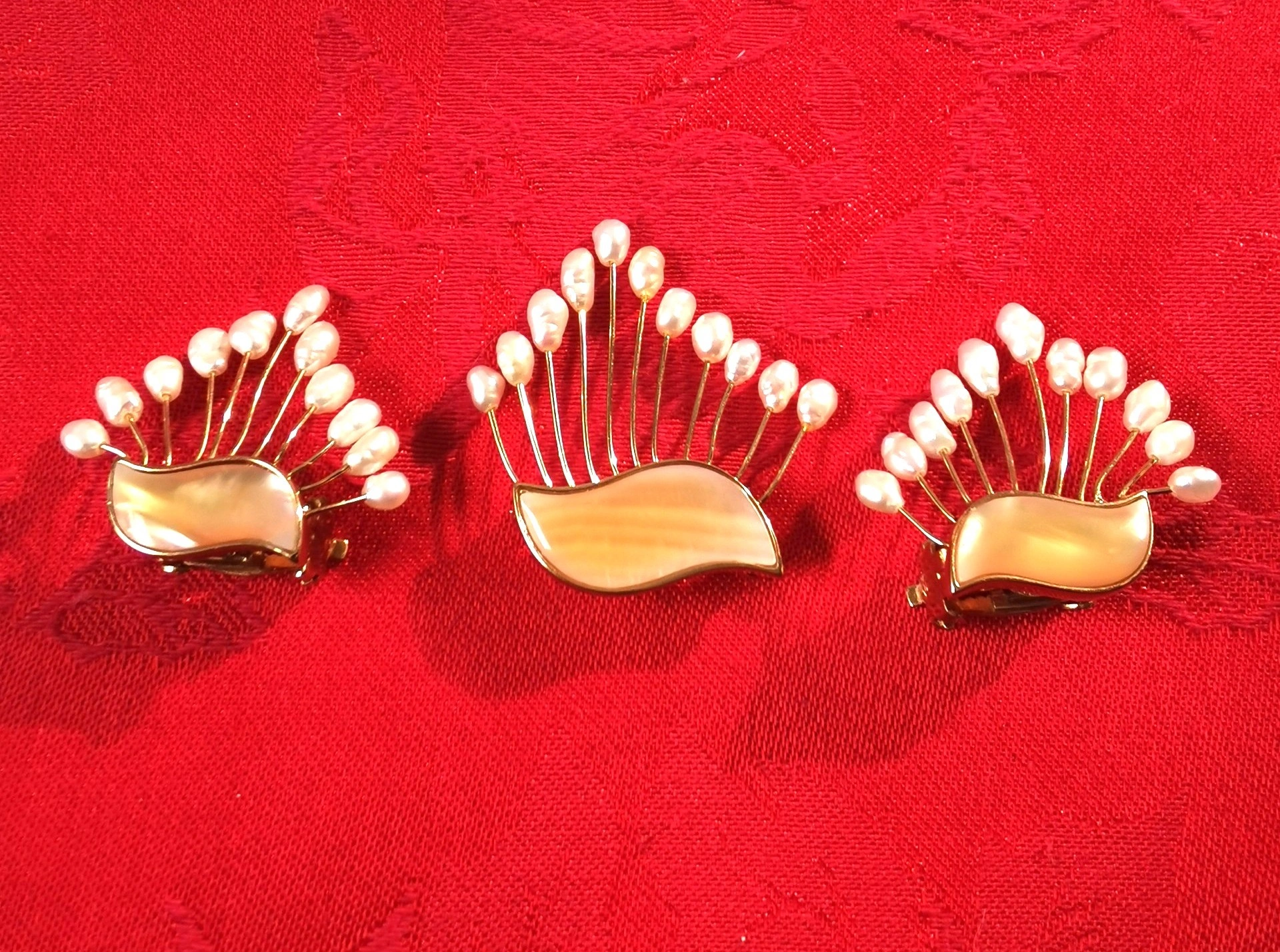 Design: Features a classic fan or plume design, centered around a beautiful, genuine Mother-of-Pearl (MOP) cabochon. Delicate gold-tone wires radiate outwards, tipped with luminous faux pearls.